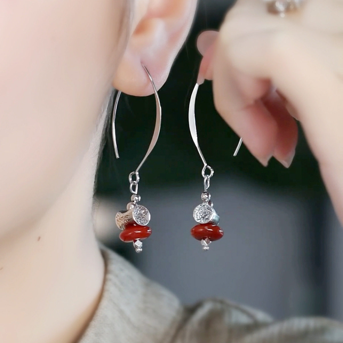 S925银红玛瑙瓜珠耳环新中式简约小众设计感复古日常