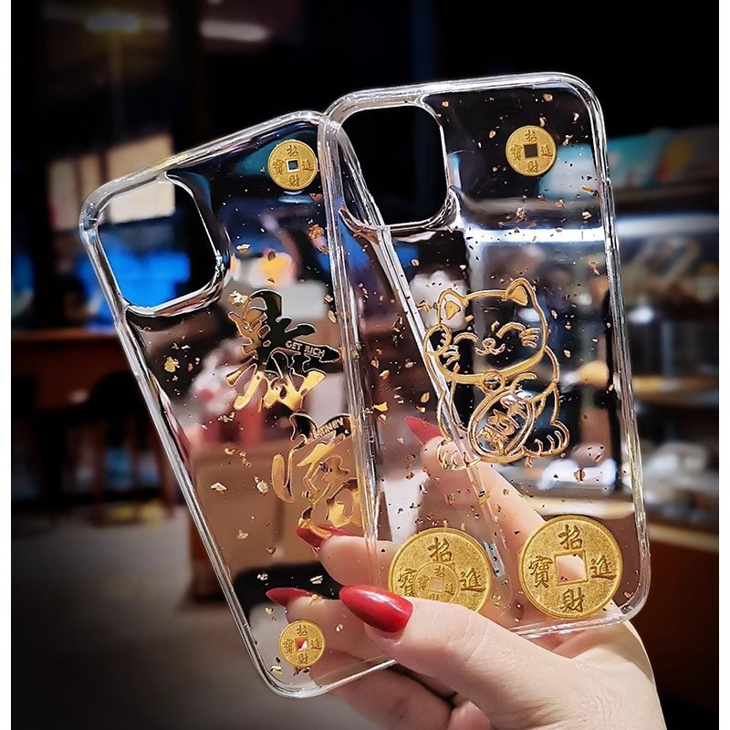 透明滴胶金箔发财暴富招财猫适用iPhone14 15promax手机壳苹果13