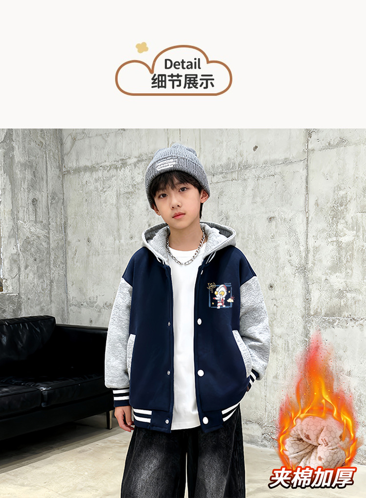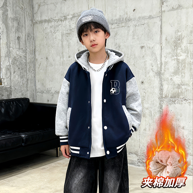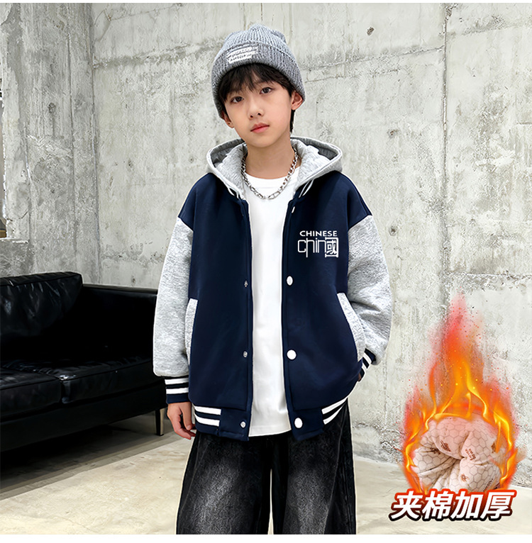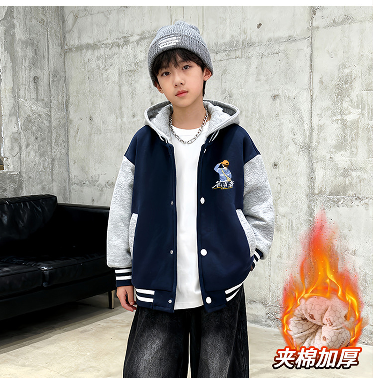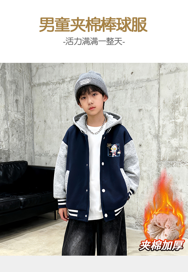 2025冬季新款儿童连帽夹棉棒球服男孩外套棉服保暖加厚棉袄中大童