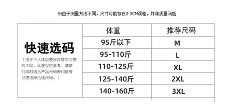 尺码 M95斤以内,L95—110斤,XL110—125斤,XXL125—140斤,3XL140—160斤