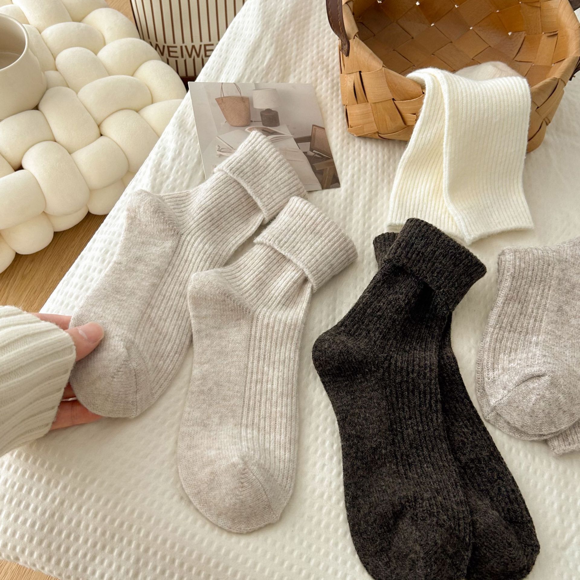 羊毛袜子女秋冬款中筒袜加绒加厚冬季保暖纯色羊绒女士长筒堆堆袜