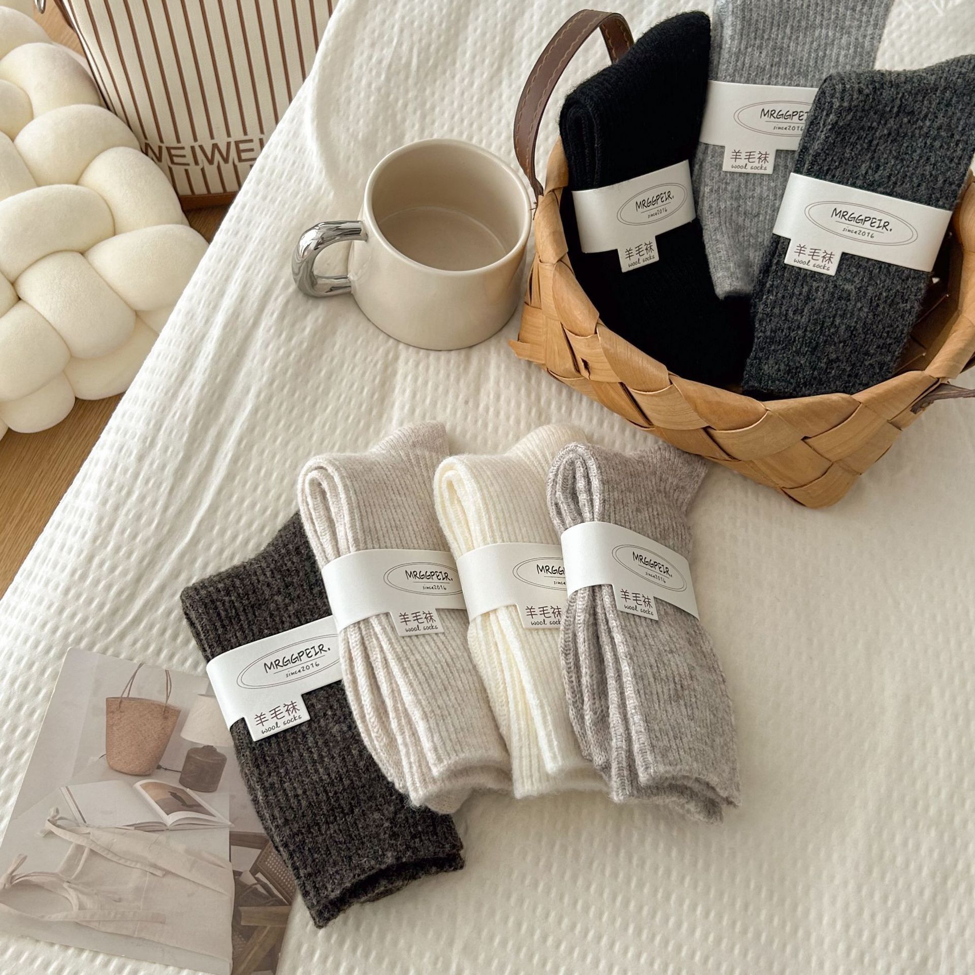 软糯灰粉羊毛袜子女~秋冬羊绒中筒袜加厚保暖日系甜美堆堆袜冬天