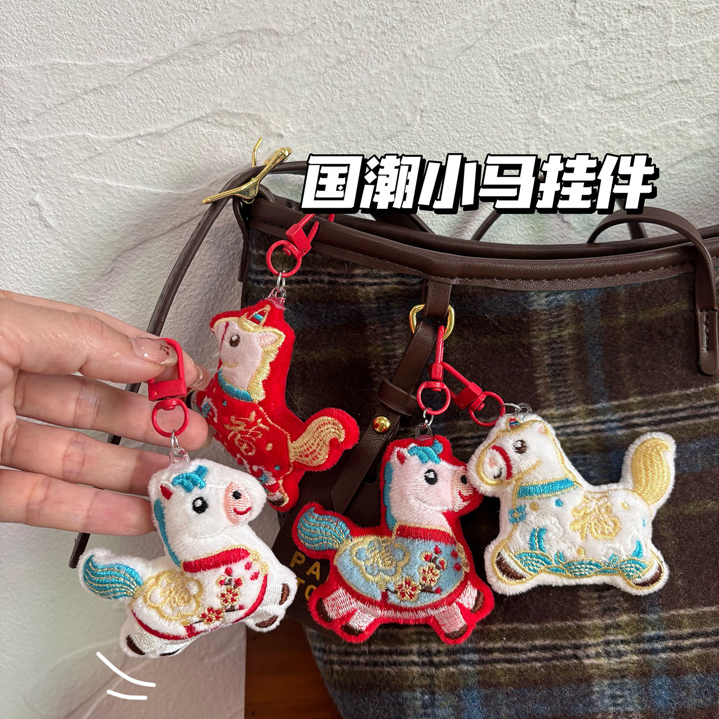 创意国潮风小马毛绒钥匙扣马上有福公仔毛绒胸针配饰新年礼物配饰