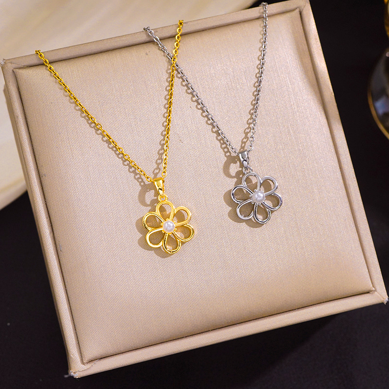 新款简约小珍珠花朵钛钢项链女经典时尚百搭锁骨链小众感饰品批发
