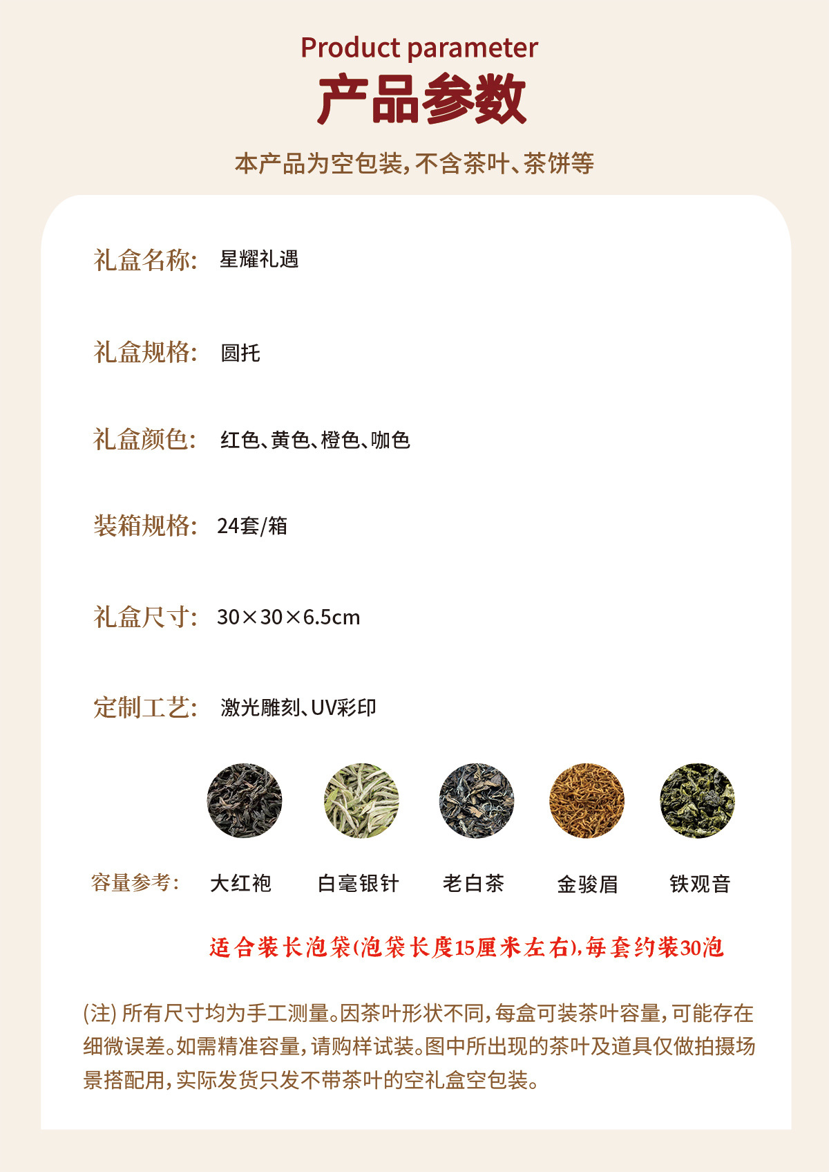 规格型号 红色 | 通版(空盒);15CM长泡袋约30泡,黄色 | 通版(空盒);15CM长泡袋约30泡,橙色 | 通版(空盒);15CM长泡袋约30泡,咖色 | 通版(空盒);15CM长泡袋约30泡,红色 | 九龙窠肉桂版面(空盒);15CM长泡袋约30泡,黄色 | 老枞水仙(空盒);15CM长泡袋约30泡,橙色 | 金骏眉(空盒);15CM长泡袋约30泡,咖色 | 马头岩肉桂(空盒);15CM长泡袋约30泡