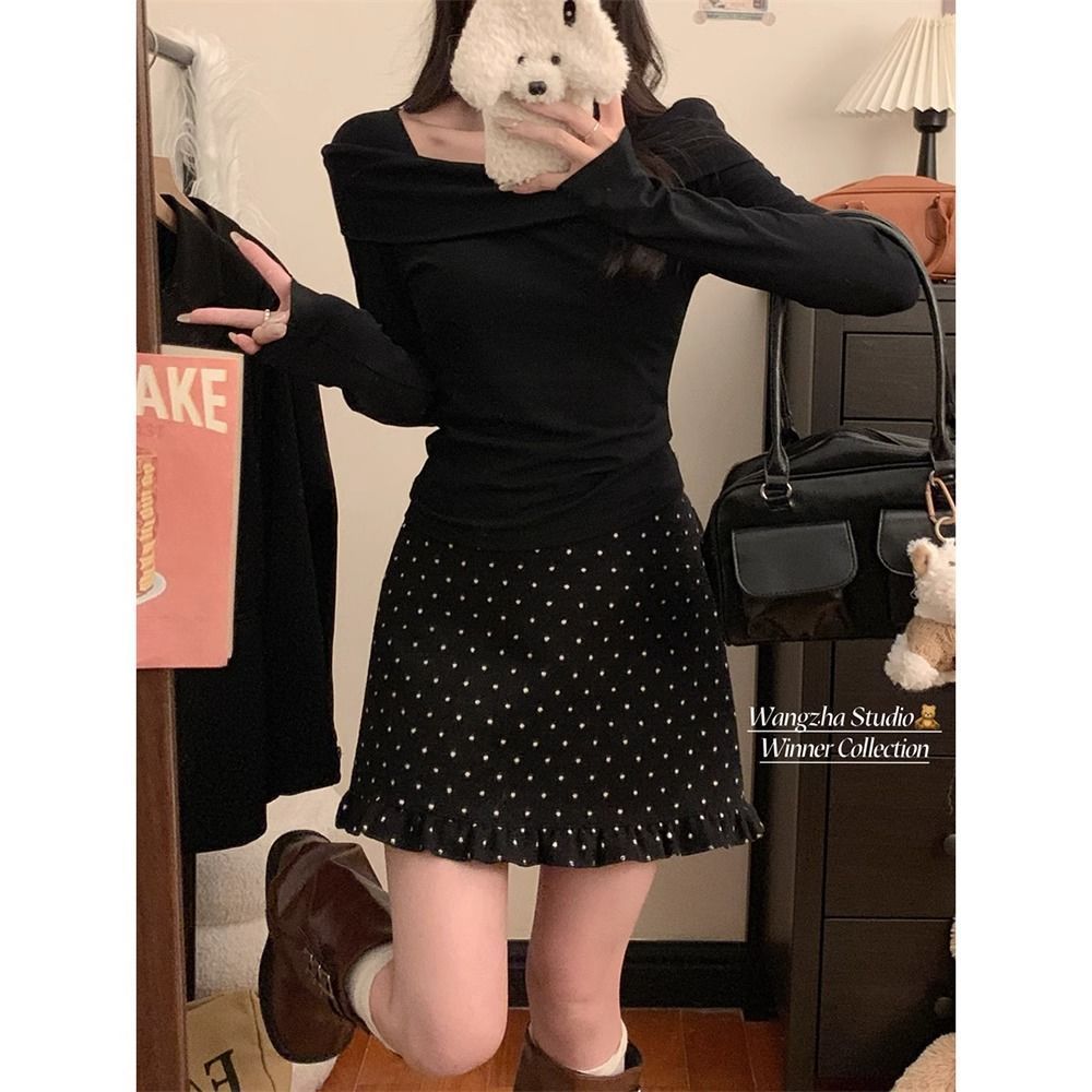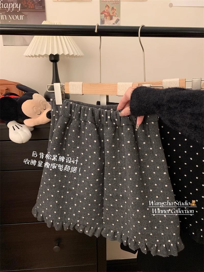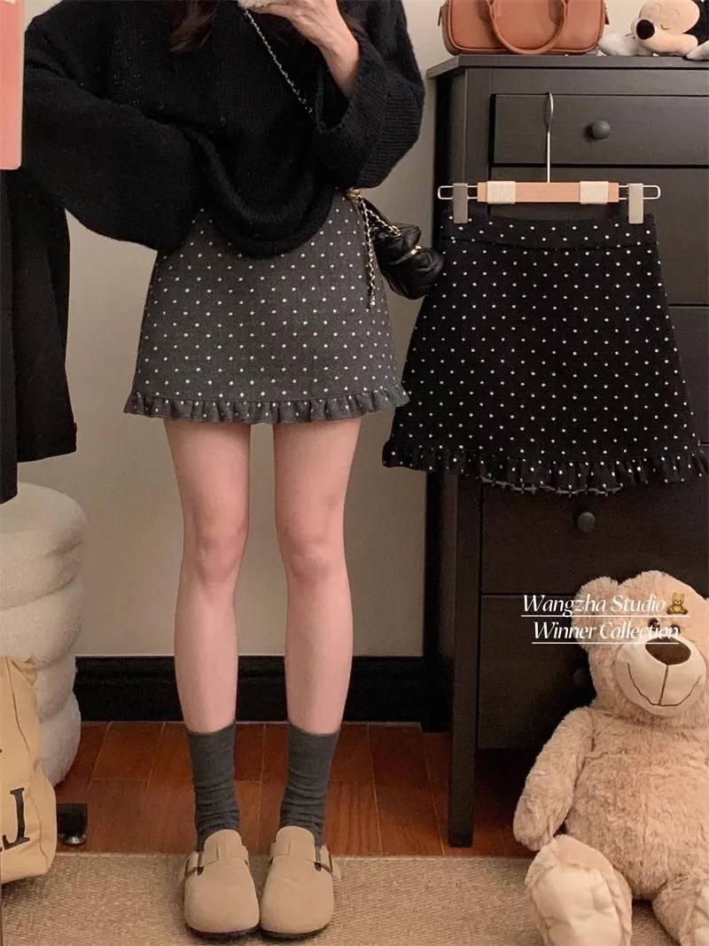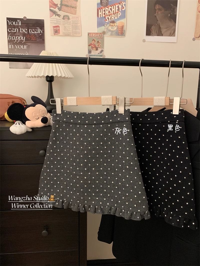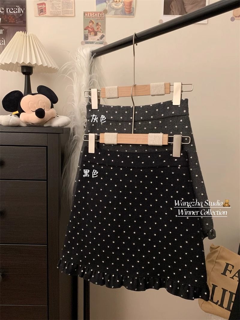 设计感木耳边波点毛呢半身裙女冬季2025新款显瘦高腰包臀A字短裙