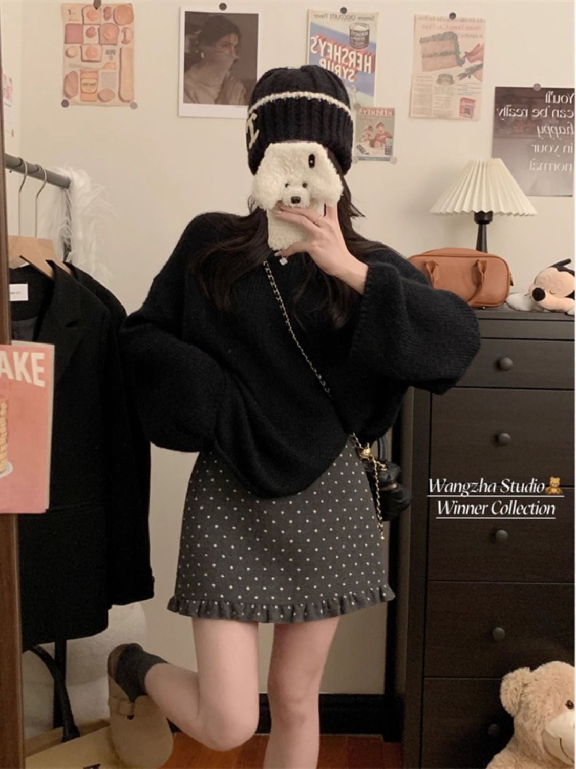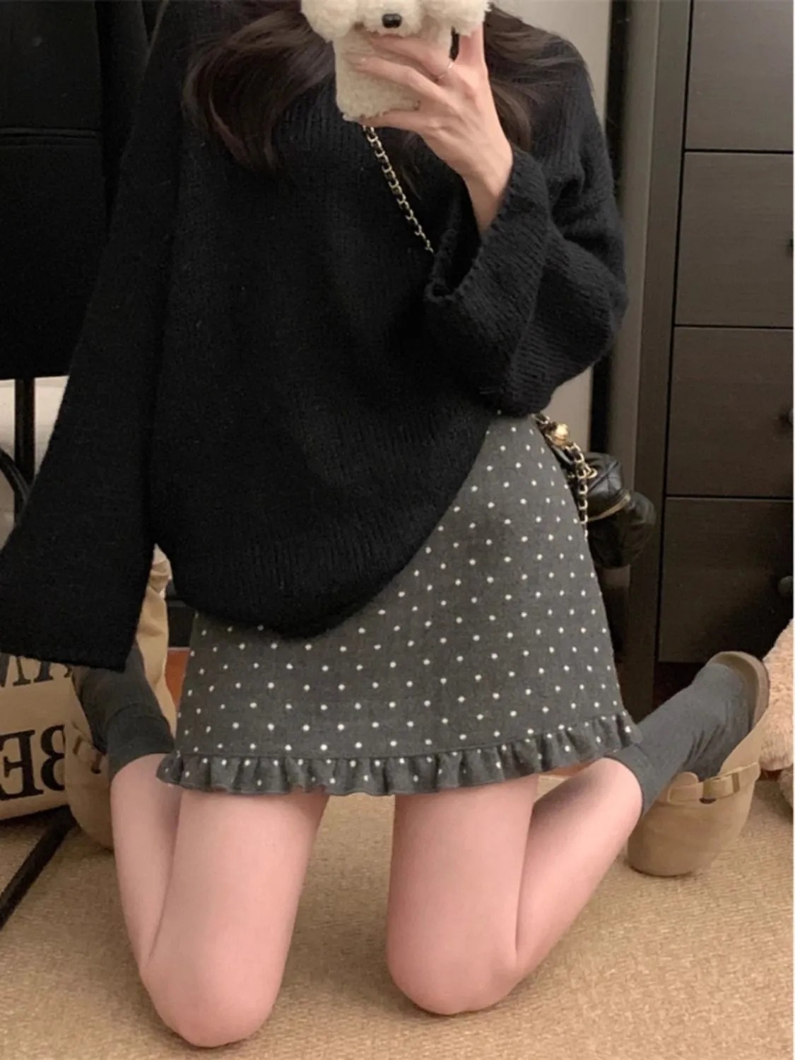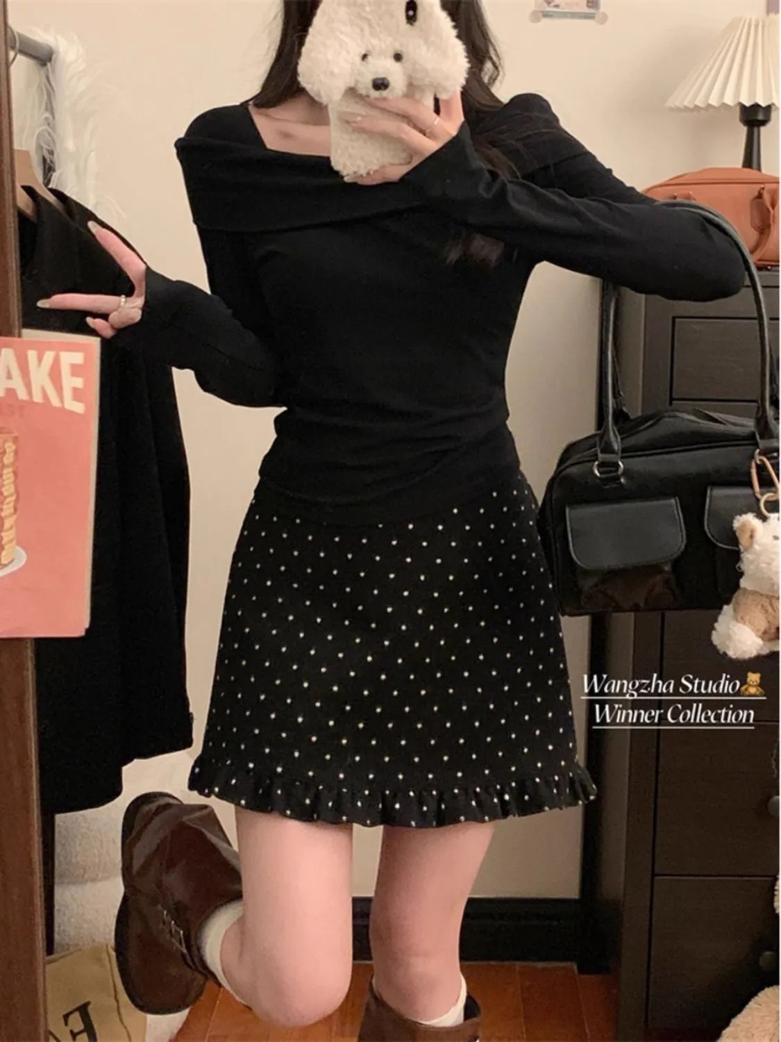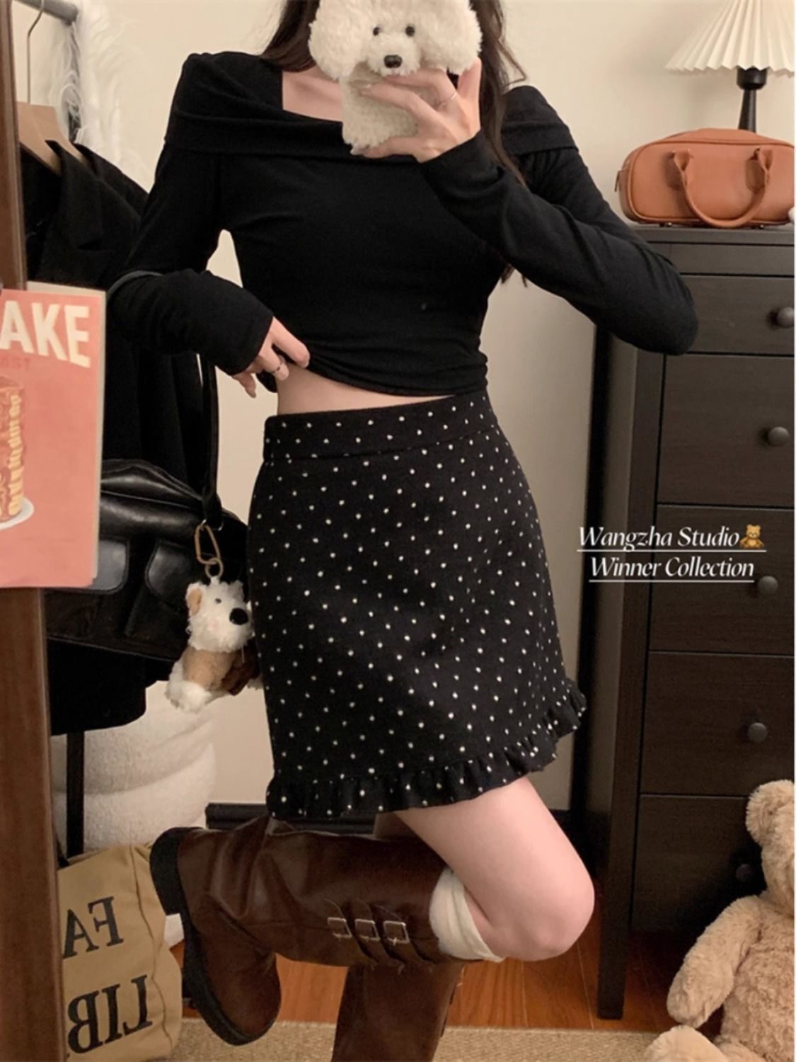 设计感木耳边波点毛呢半身裙女冬季2025新款显瘦高腰包臀A字短裙