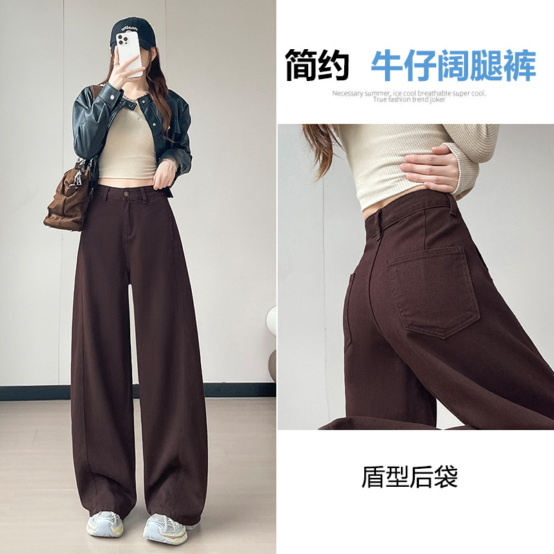 美式深咖色阔腿加绒牛仔裤女秋冬季2025新款高腰宽松棕色弯刀裤子