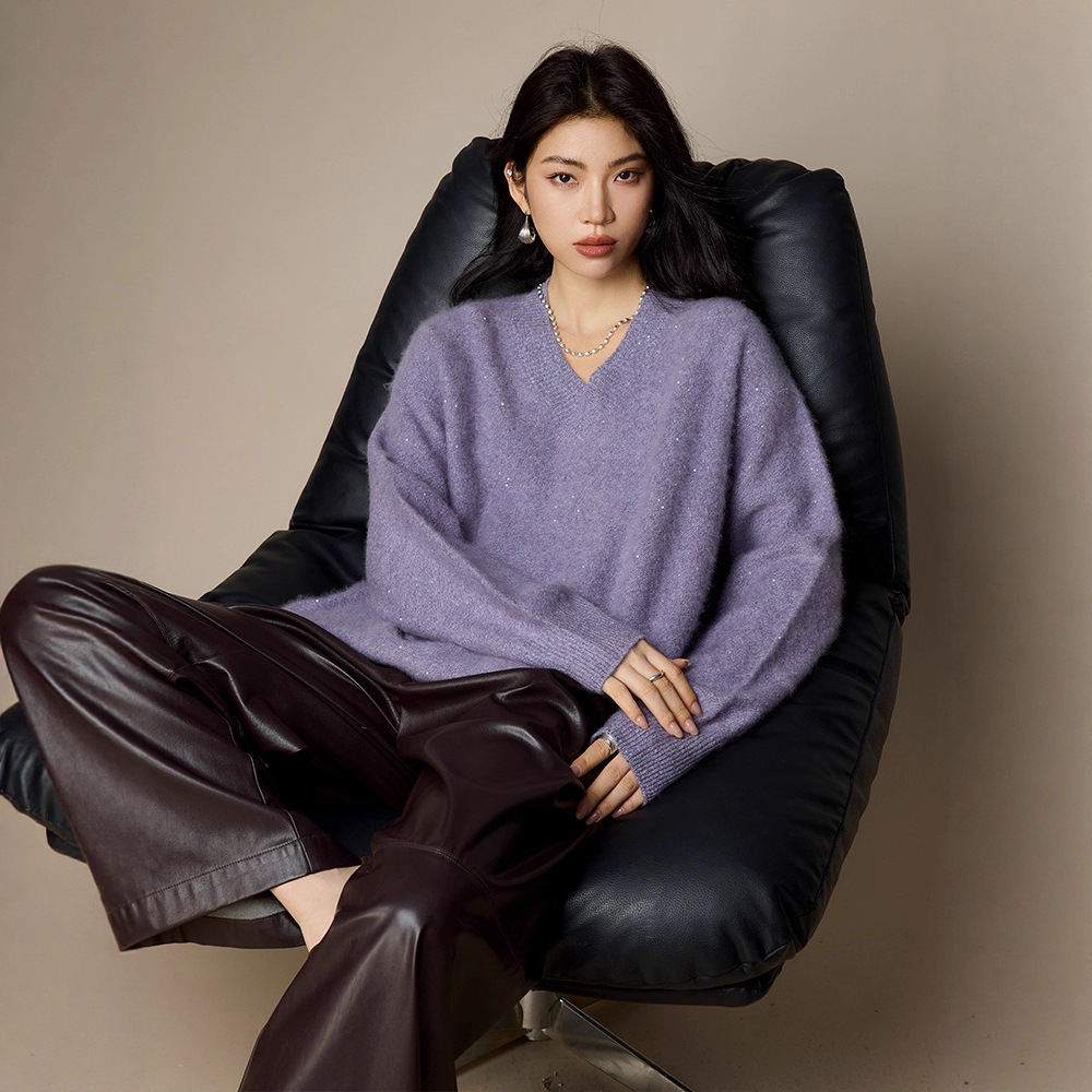 [拉毛系列]珠片花纱拉毛毛衣女秋冬羊毛衫2025新款女装v领针织衫