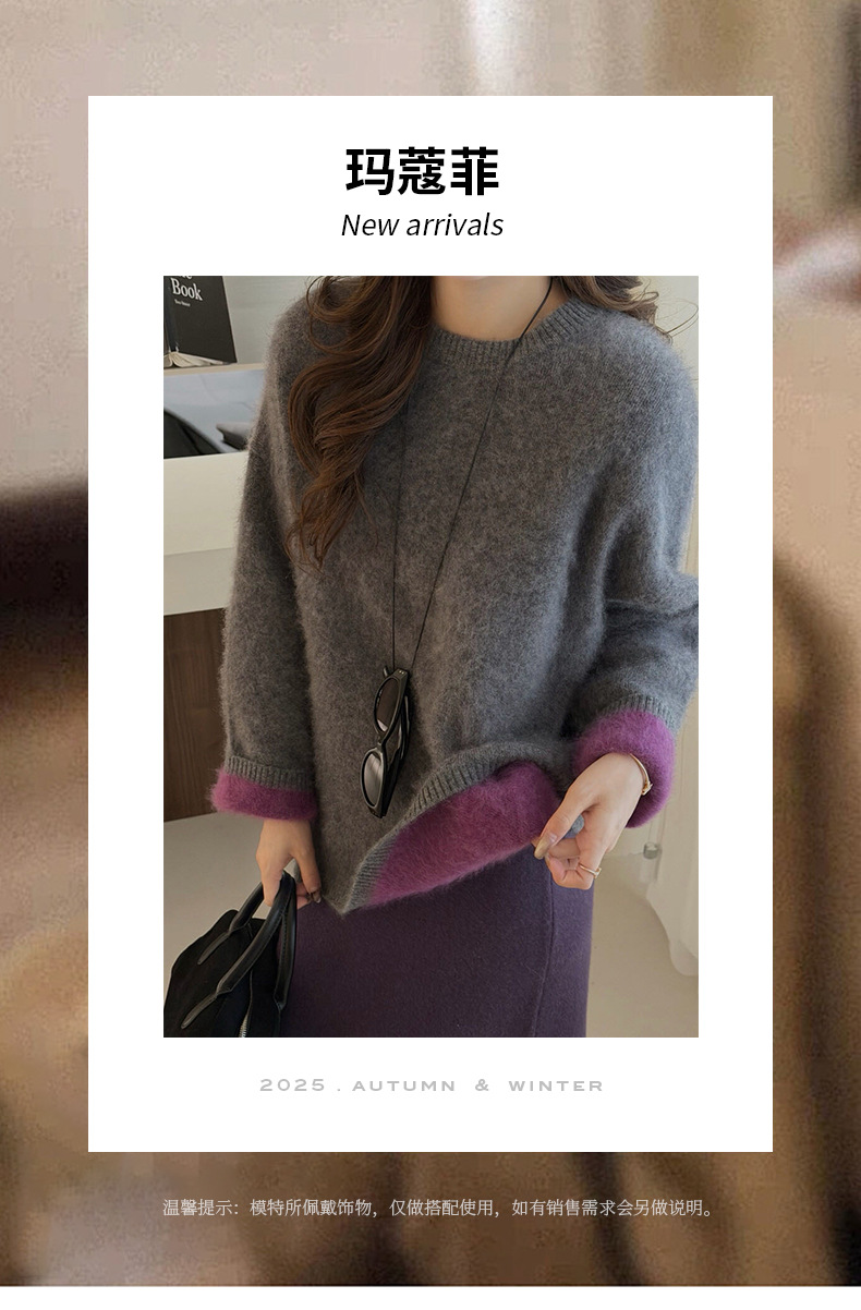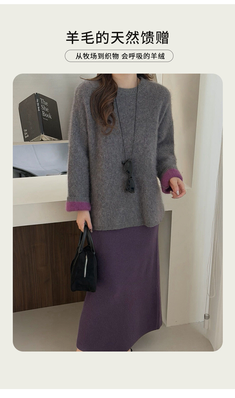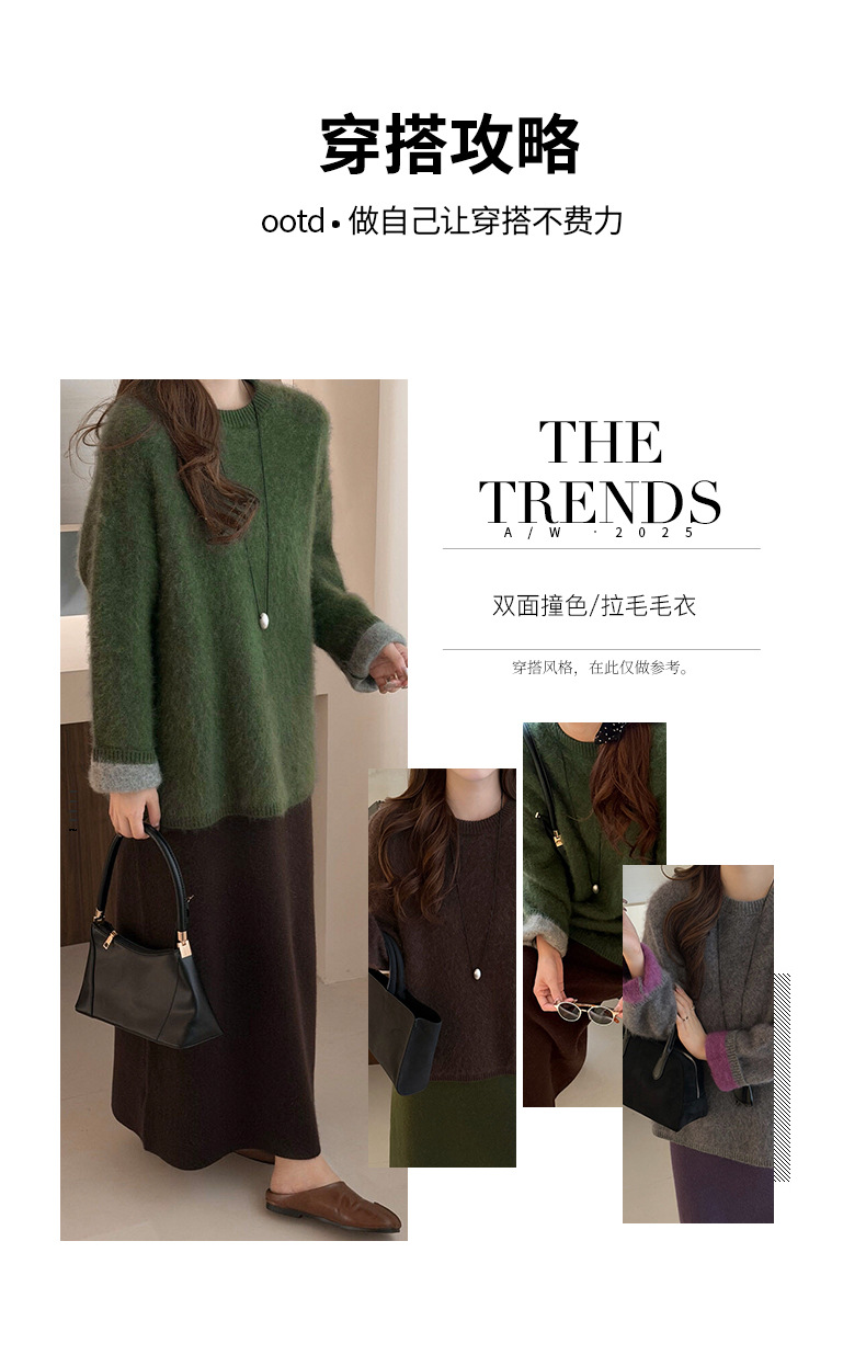 [拉绒系列]纯羊毛毛衣女秋冬2025新款女装双色加绒加厚圆领针织衫
