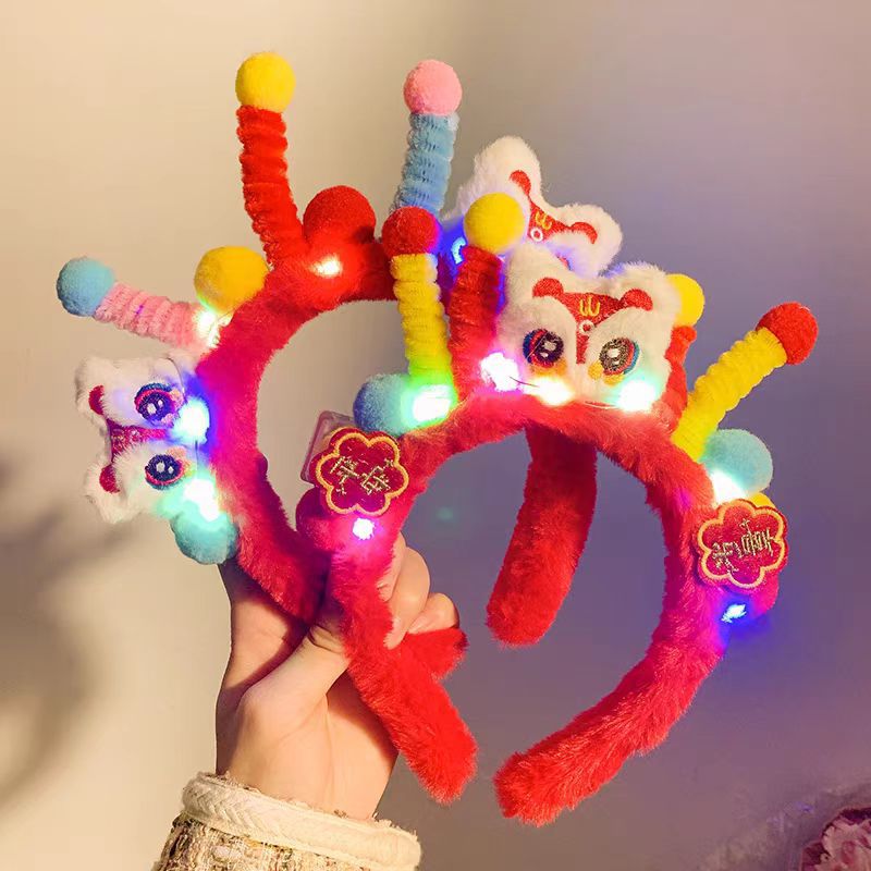 新年のねじり棒が目を覚ますライオンのカチューシャは新年のお祝いの赤いカチューシャ幼稚園のショーの写真を撮ってカードを出して明かりをつけて飾ります。