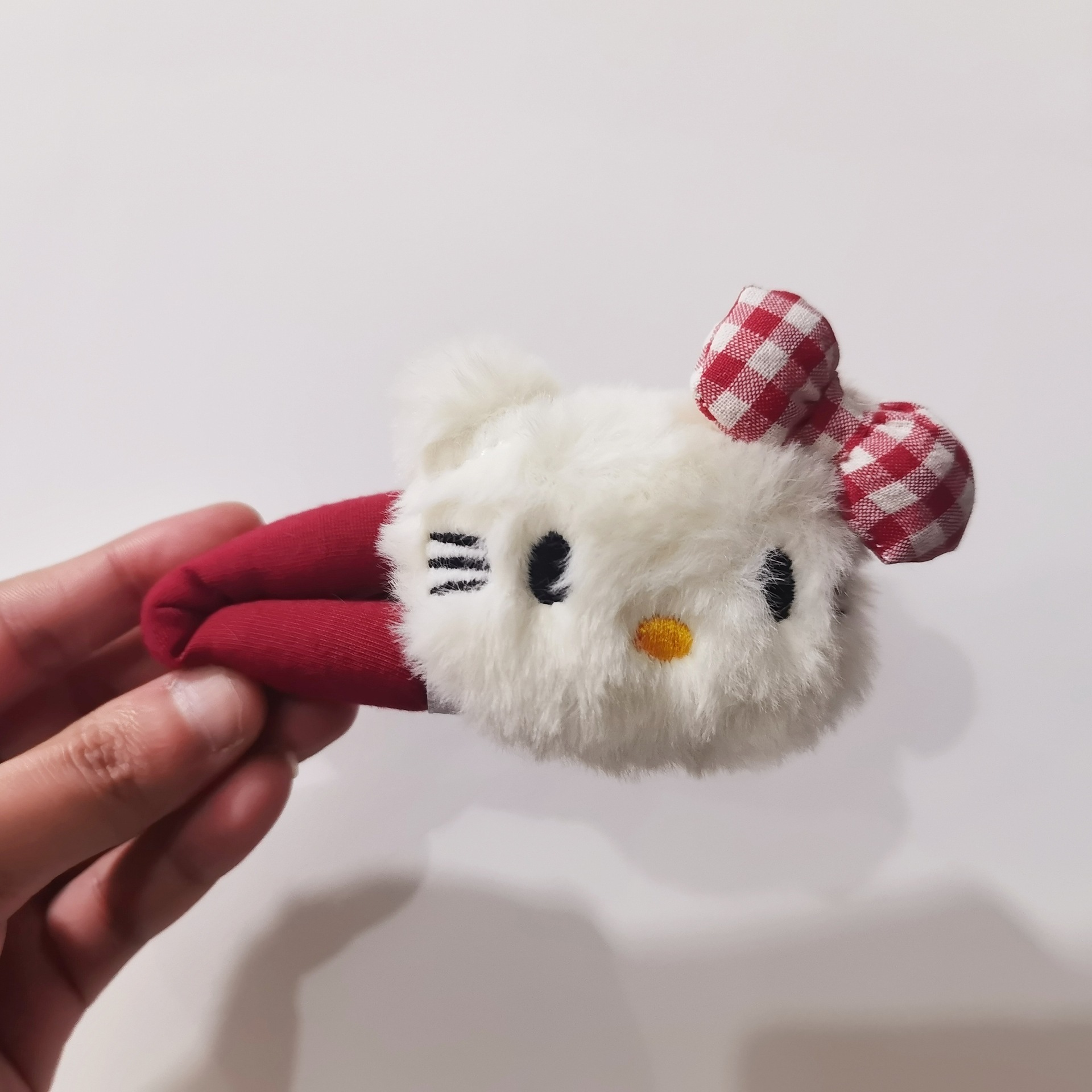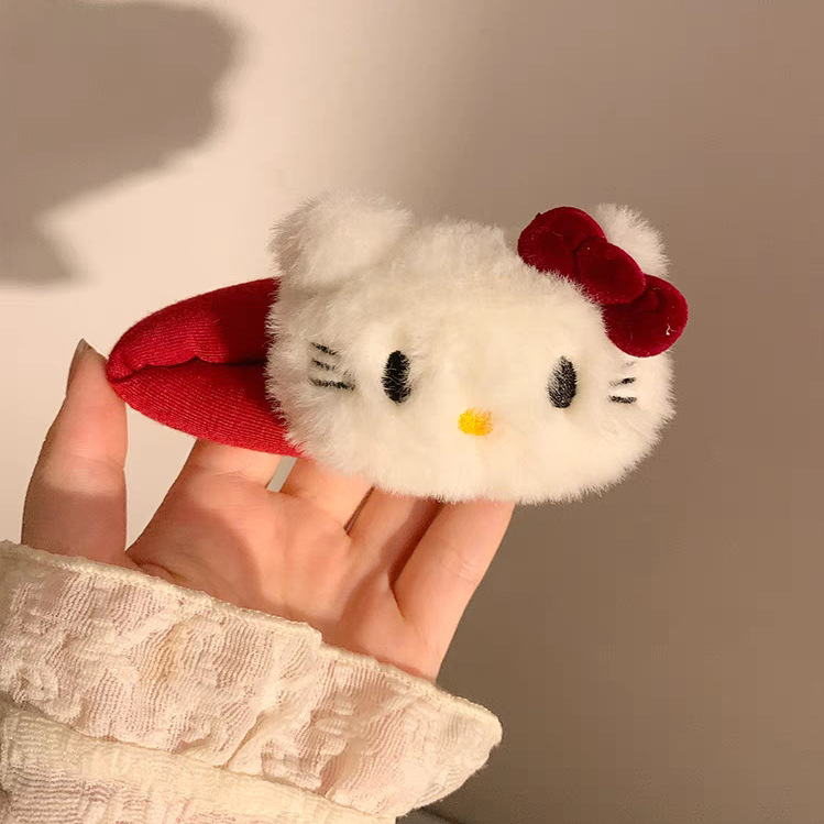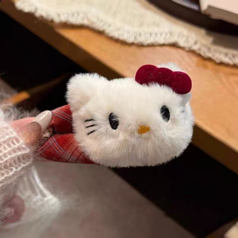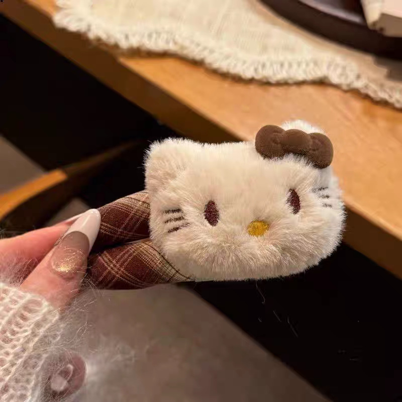 新款甜美格纹Kitty发夹女可爱卡通毛绒掰掰夹侧边bb夹发卡头饰品