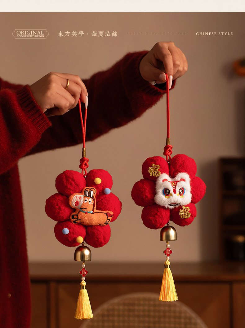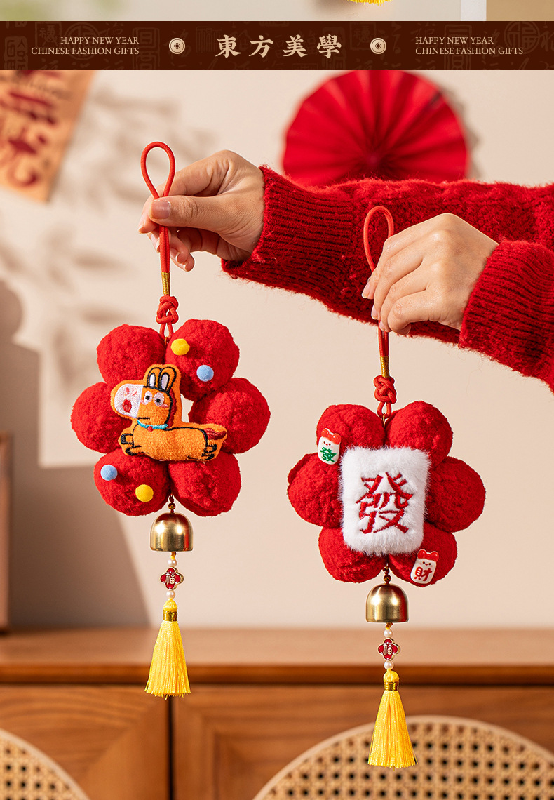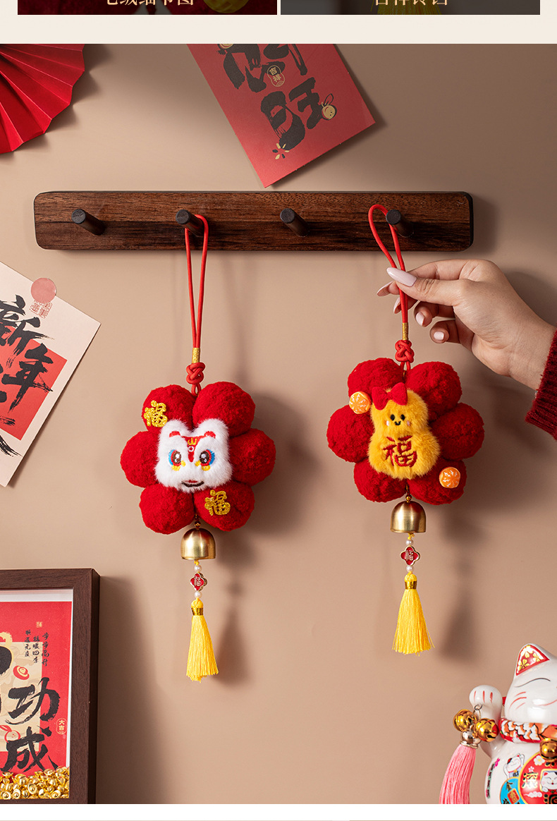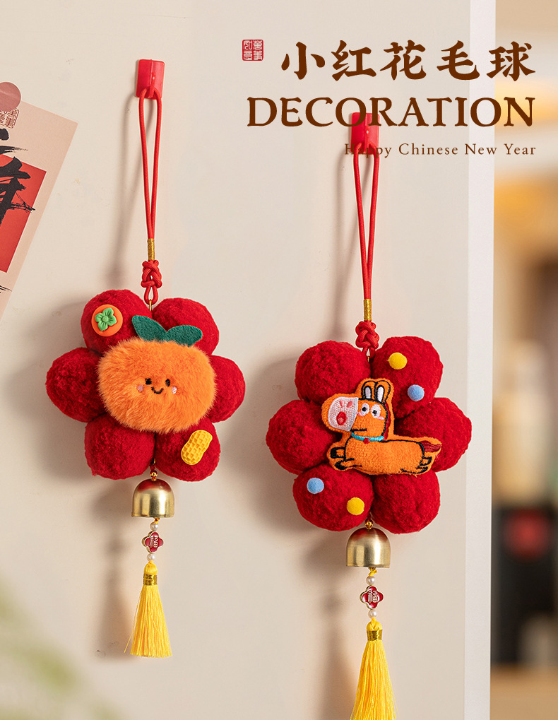 新年春节装饰品小红花创意毛球挂饰过年入户门把手车载挂件氛围感
