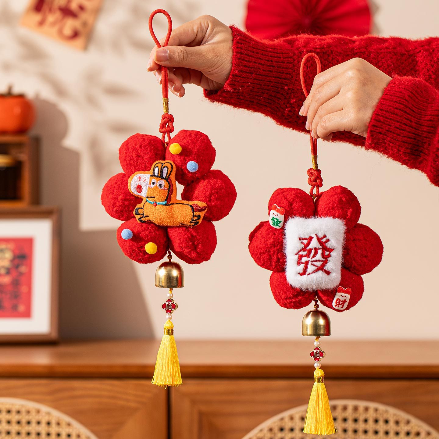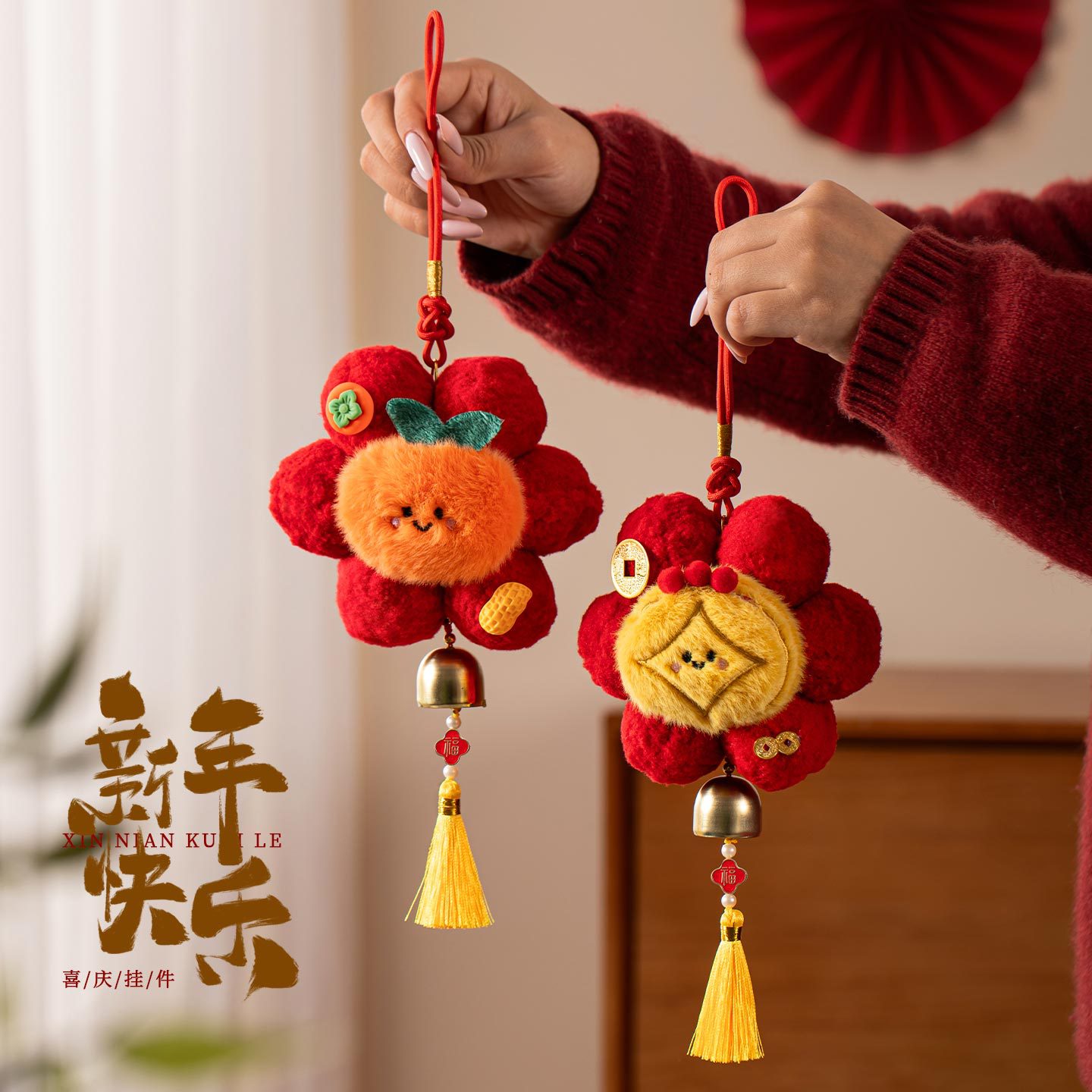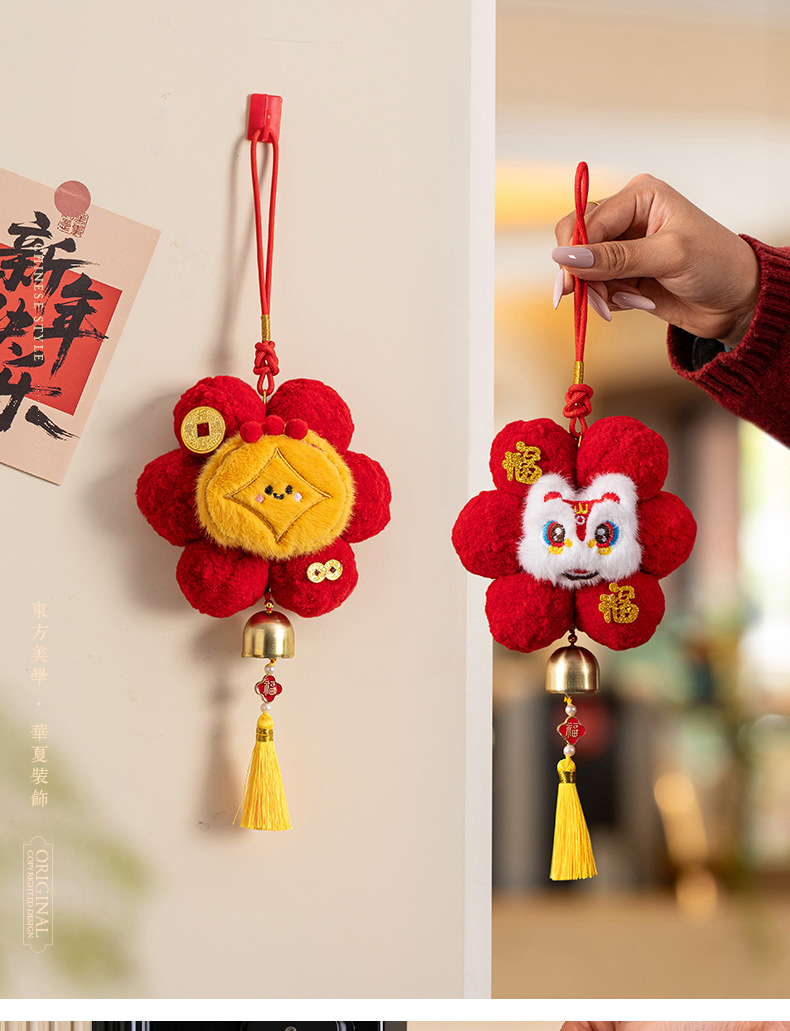 新年春节装饰品小红花创意毛球挂饰过年入户门把手车载挂件氛围感