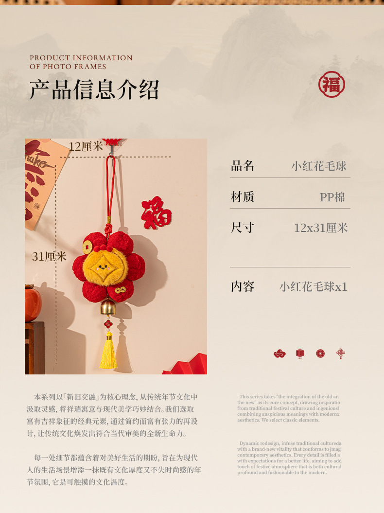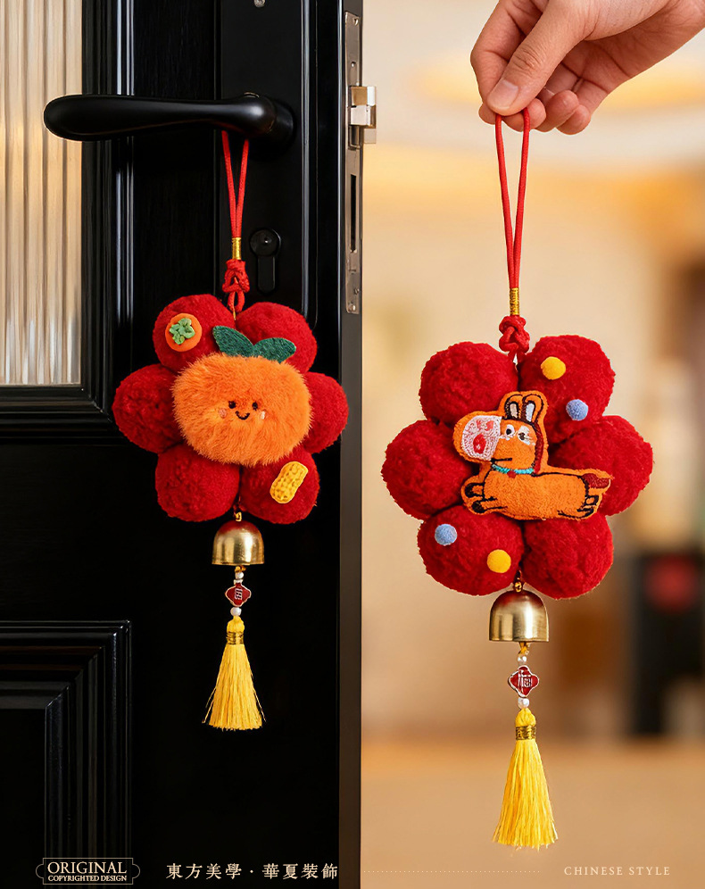 2026新款新年挂件创意小红花装饰品马年春节毛球喜庆门把手小挂饰