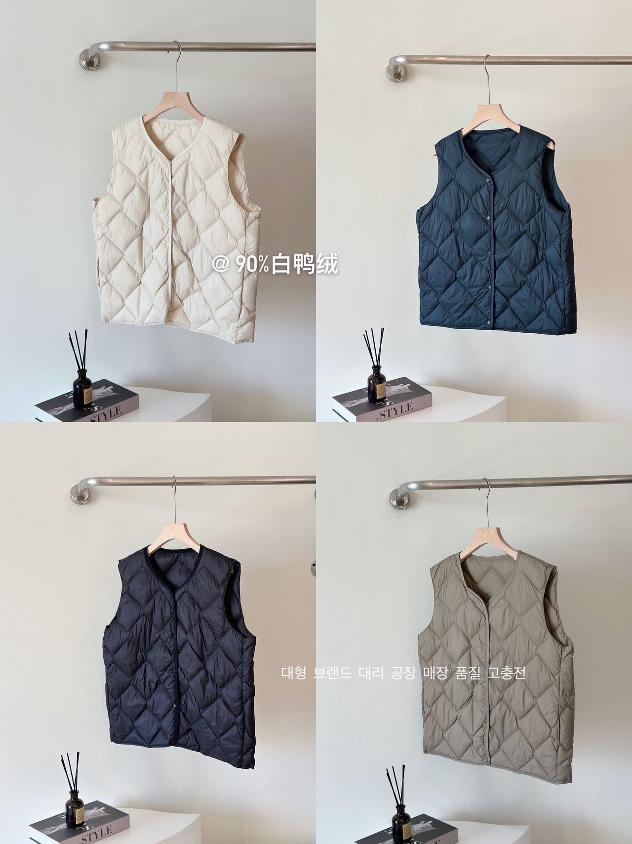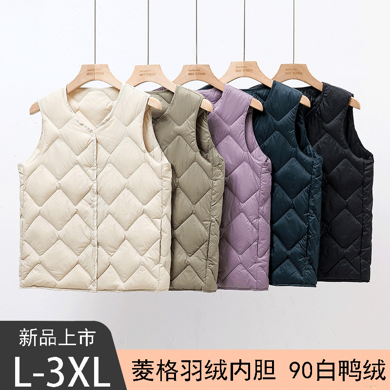 秋冬新作菱形格雲朵柄レディースショートダウンベスト、おしゃれなVネックインナーベスト、軽量ベストジャケット