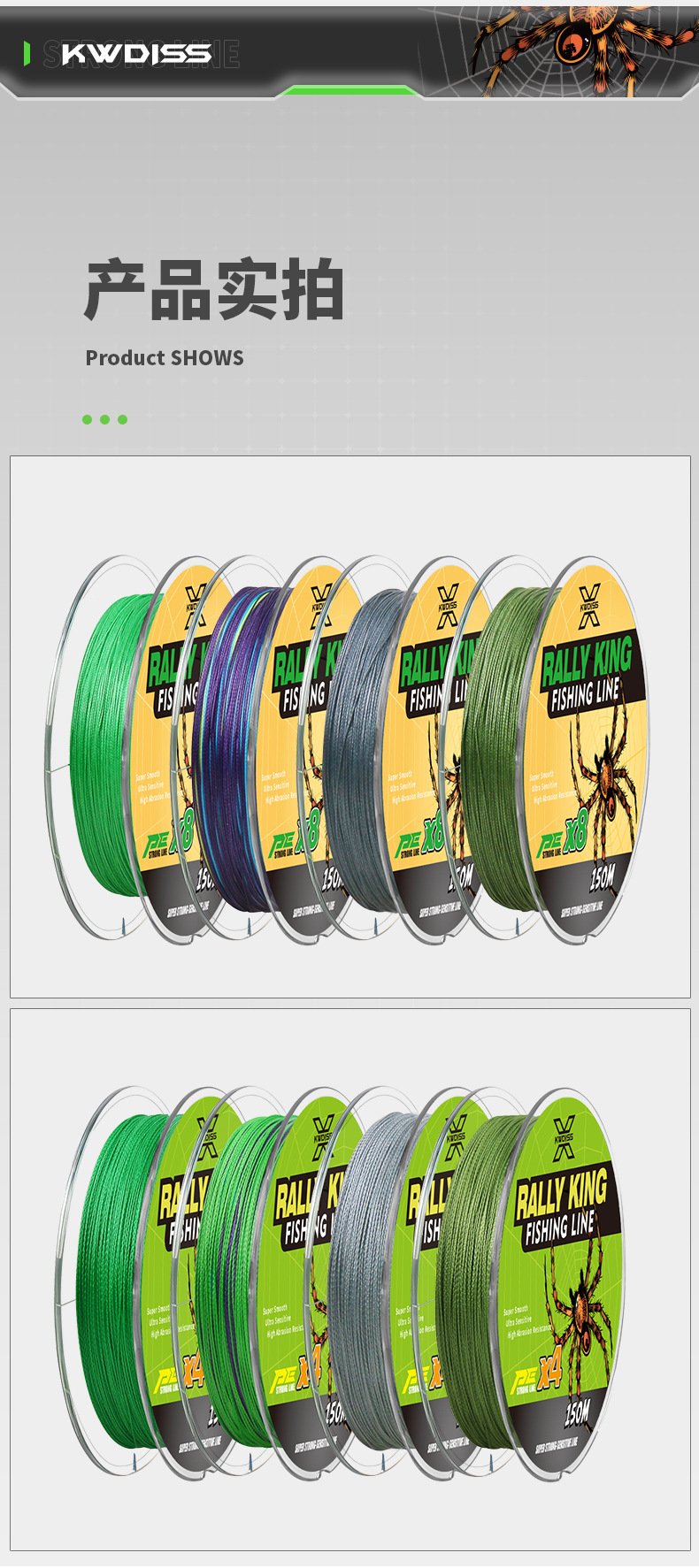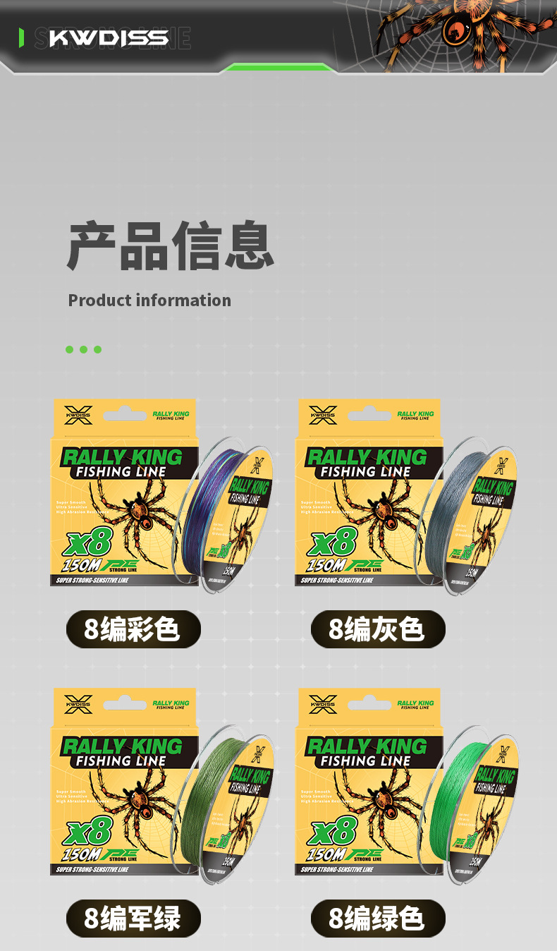 颜色 8编150米五彩(蜘蛛),8编150米绿色(蜘蛛),8编150米灰色(蜘蛛),8编150米军绿(蜘蛛),4编150米五彩(蜘蛛),4编150米绿色(蜘蛛),4编150米灰色(蜘蛛),4编150米军绿(蜘蛛),8编黄色100米(蝎子),8编灰色100米(蝎子),8编军绿100米(蝎子),8编绿色100米(蝎子),8编五彩100米(蝎子),4编黄色100米(蜘蛛),4编灰色100米(蜘蛛),4编军绿100米(蜘蛛),4编绿色100米(蜘蛛),4编五彩100米(蜘蛛)