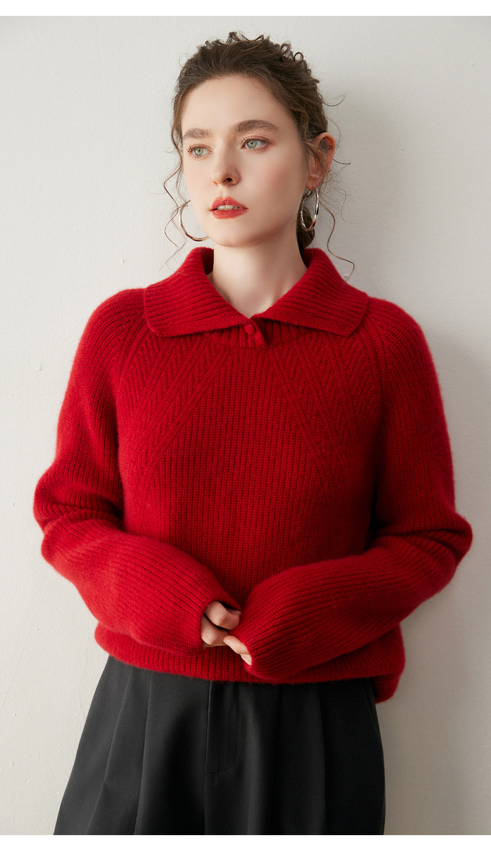 红色100%纯山羊绒衫女欧货翻领秋冬针织加厚新年本命年圣诞红毛衣