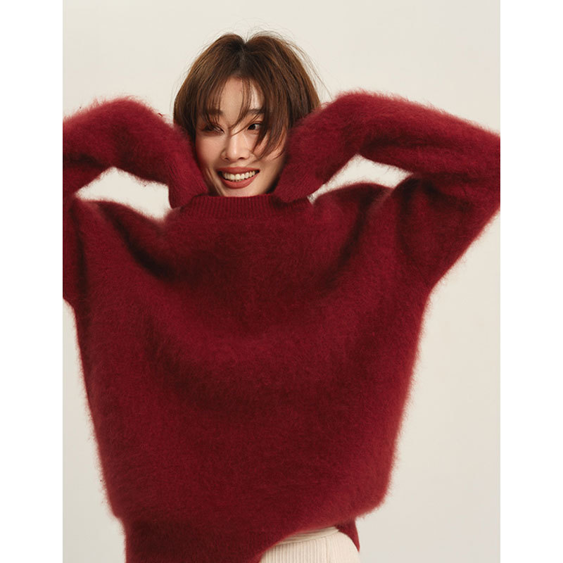 怠惰な風の柔らかいモチモチの新年の赤い丸首のセーターの女性の秋冬の高級感の中でニットの雰囲気の上着を掛けます。