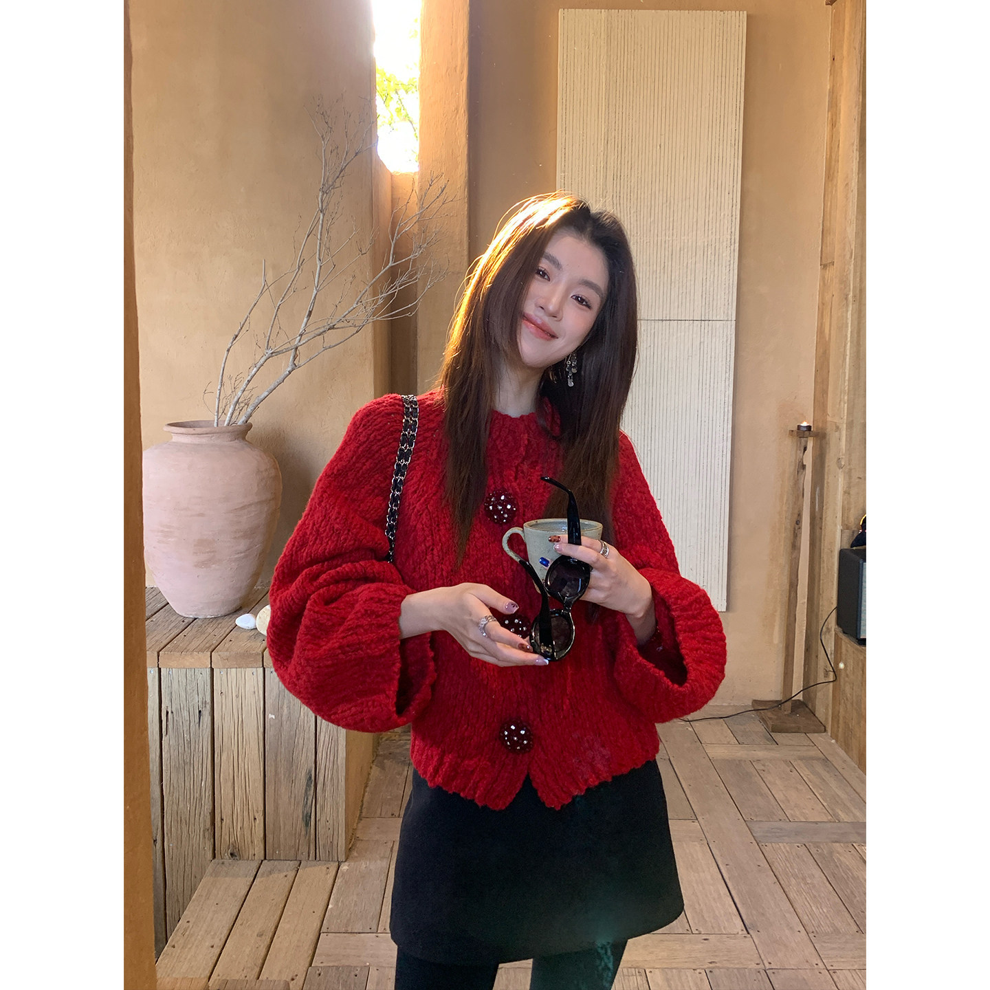 【红绯酒心】Jomi高奢羊毛招财红色绞花软糯经典老钱开衫