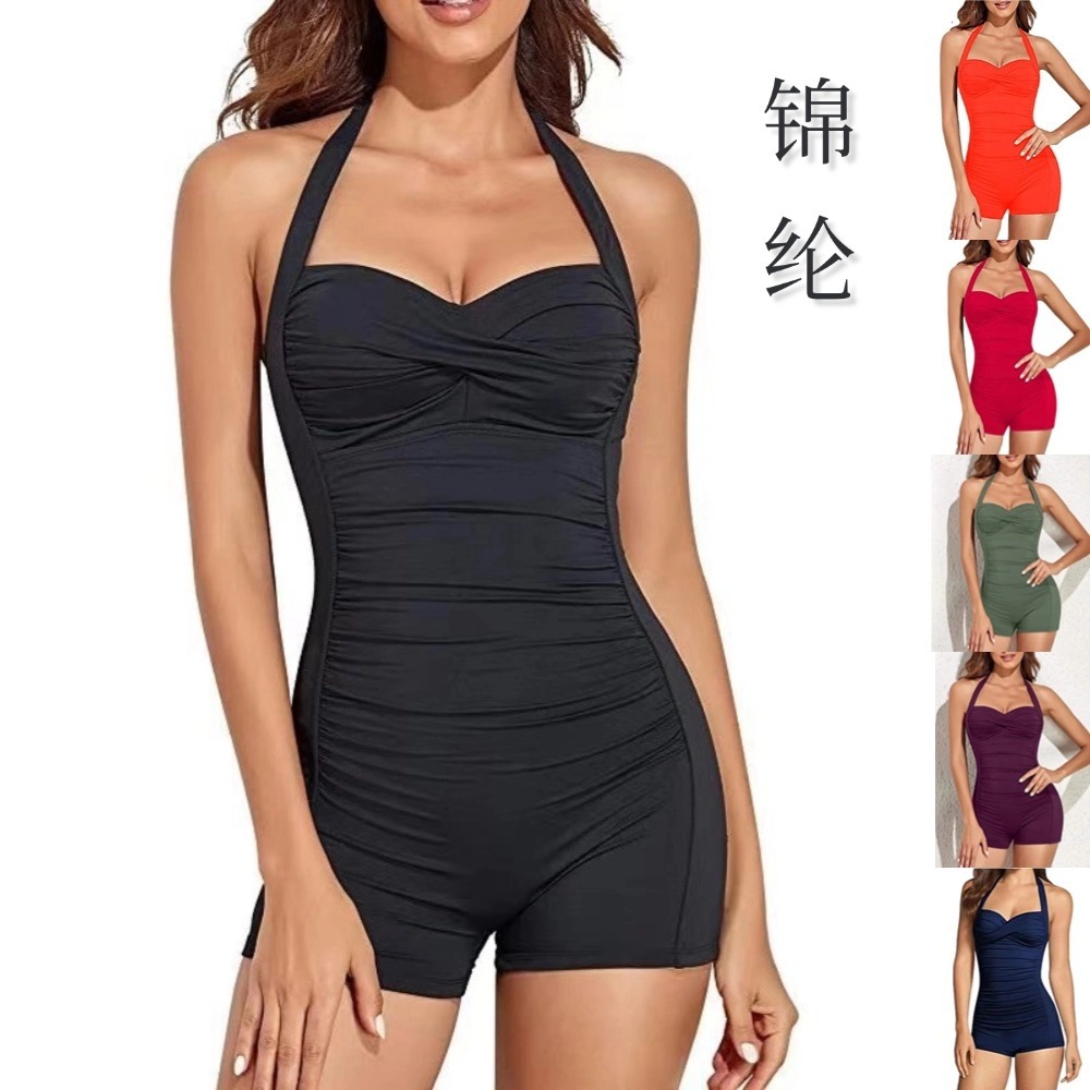 ヨーロッパとアメリカの貿易ホットスタイル 2025 襟サスペンダーワンピース水着女性ヨーロッパとアメリカのセクシーなクロスボーダーウエストサイド巾着水着女性