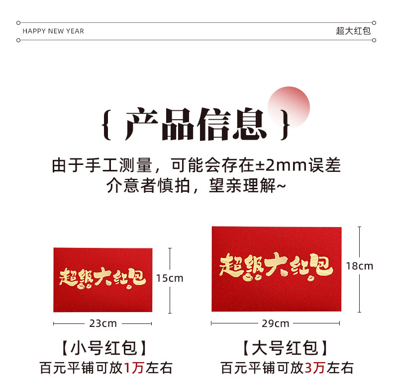 颜色 【超大红包】一个亿/1个装(可装800-5W),【超大红包】马上有钱/1个装(可装800-5W),【超大红包】多财多亿/1个装(可装800-5W),【金葱超大红包】小号/1个装(可装1W),【金葱超大红包】大号/1个装(可装3W)