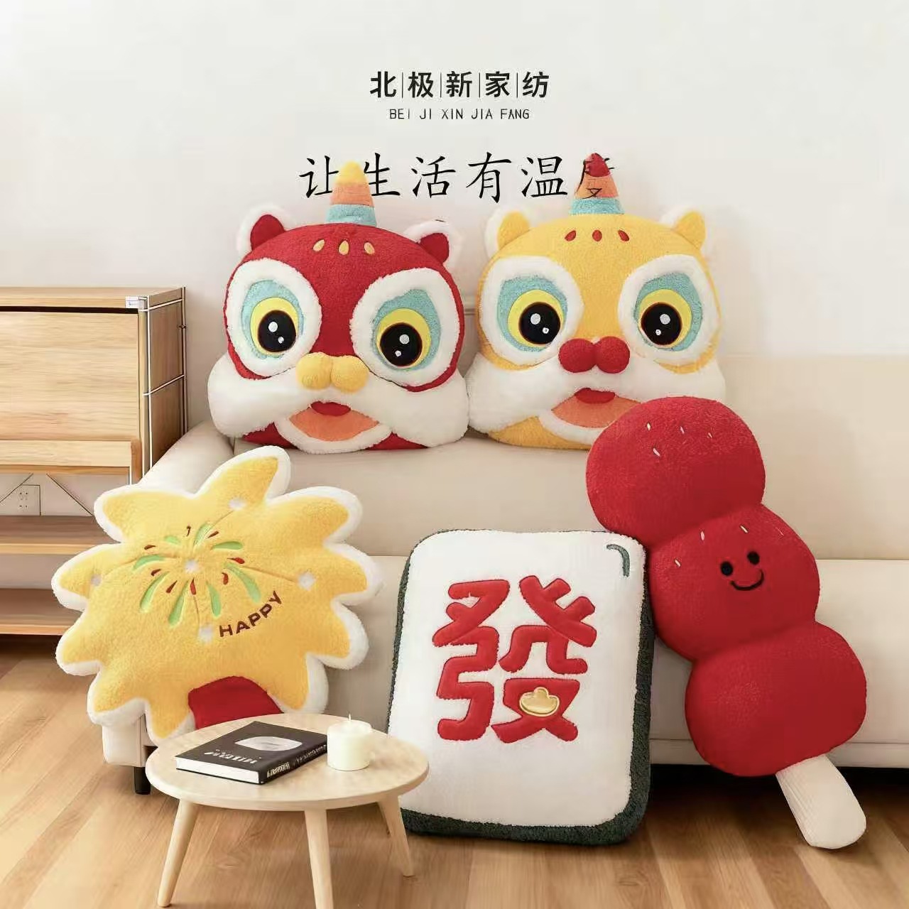 国潮红色醒狮沙发抱枕烟花靠枕冰糖葫芦玩偶客厅床头装饰礼物批发