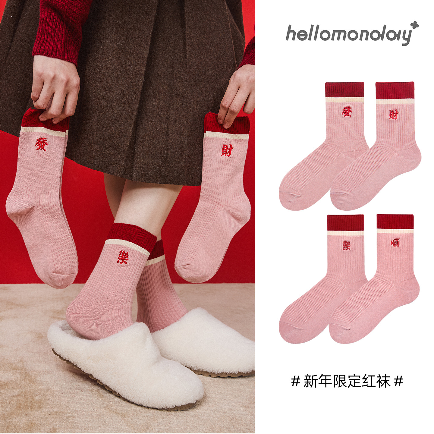 诸暨袜子84414双针新年红色袜子粉色中筒袜刺绣本命年保暖吸汗女