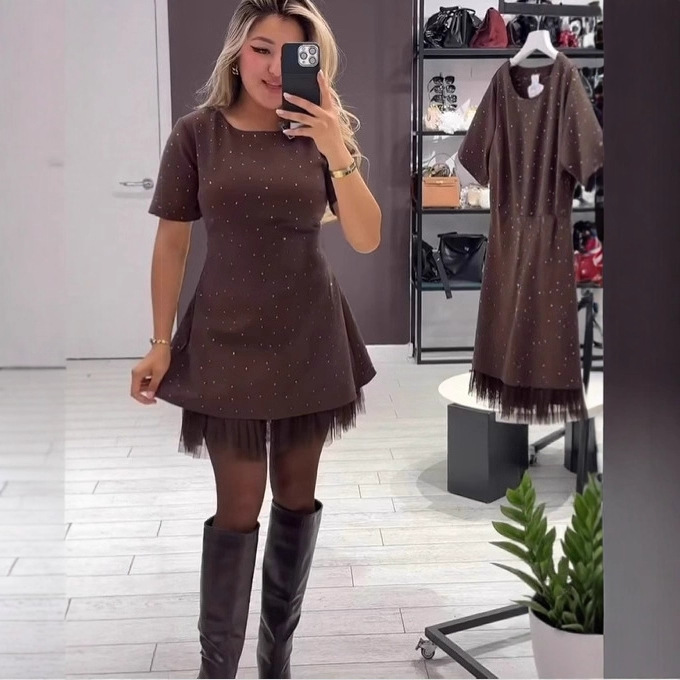2025跨境欧美春夏新款烫钻下摆网纱缩褶纯色通勤时尚连衣裙女装