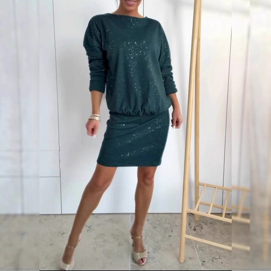 2025欧美跨境亚马逊独休闲通勤圆领长袖短款洒金连衣裙