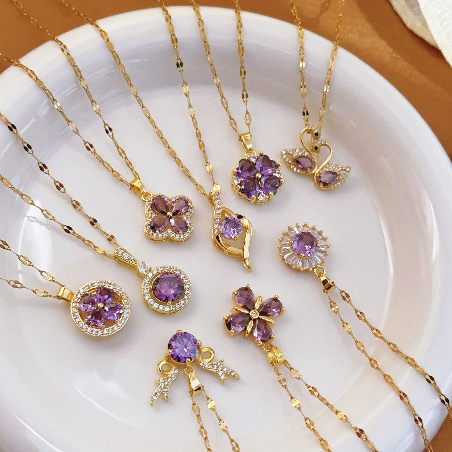 紫色爆款幸运锆石系列吊坠钛钢项链女气质个性百搭锁骨链饰品批发