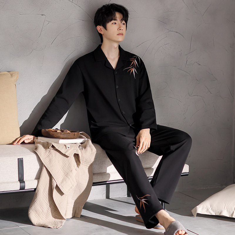 男性パジャマ春秋クレープ純綿二重綿カーディガン部屋着ゆったり大きいサイズ長袖長ズボン部屋着