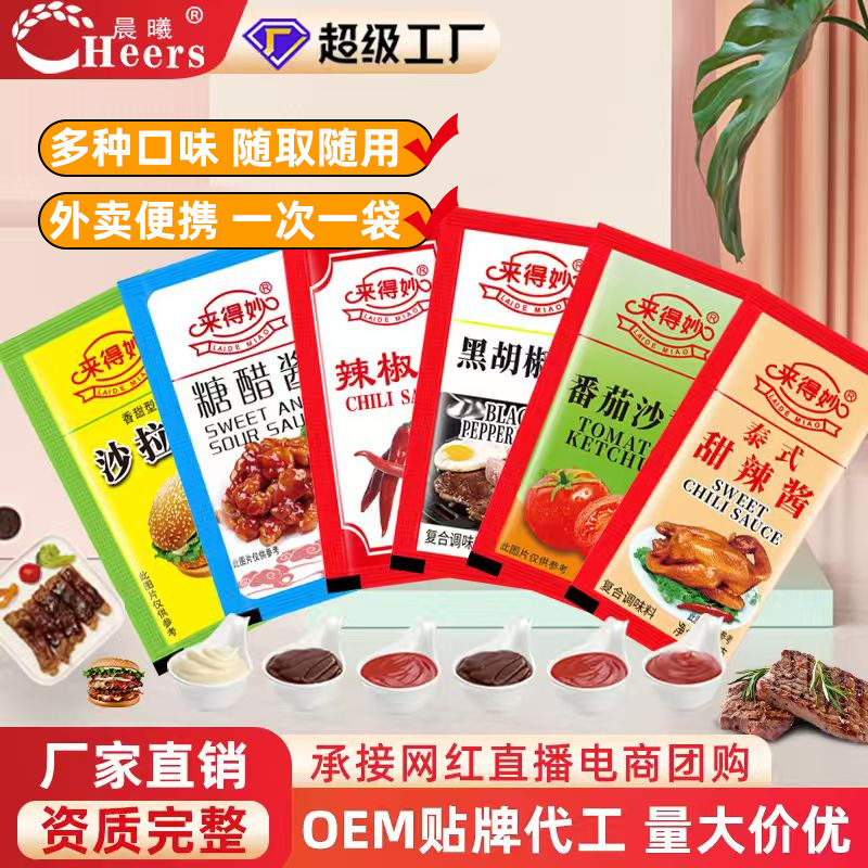 テイクアウトの調味料はトマトの沙司のタイ式の甘辛の味噌の甘酢の黒椒の商用のサラダの味噌の包みのクミンの粉の卸売りを包みます。