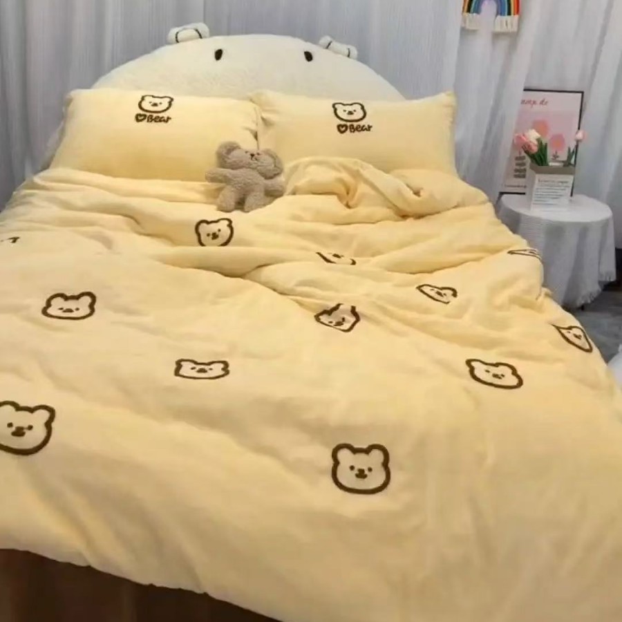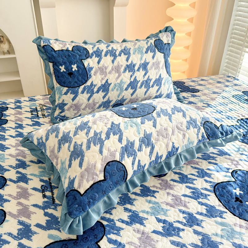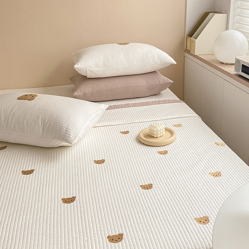 Ins韓国熊刺繍a類綿床蓋三点セット綿滑り止めシーツ四季キルティング毛布母子