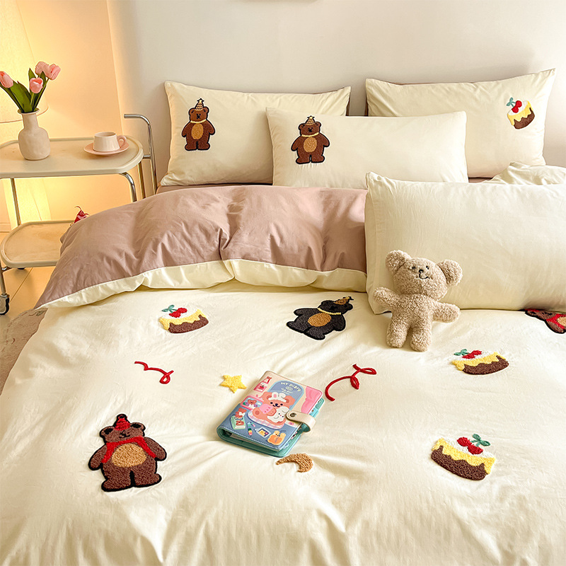 クリーム風クマウォッシュコットン寝具4点セット漫画かわいいベッドシーツキルトカバー寮3点セットベッドシーツ