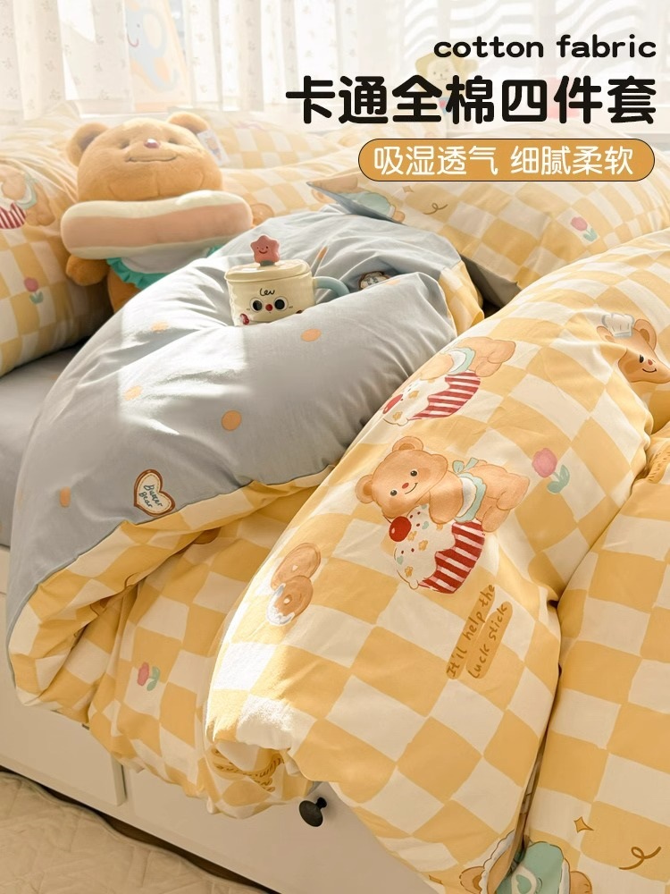 純綿4点セット子供用アニメ熊シーツ布団カバーベッド笠学生シングル寮ベッド3点セット