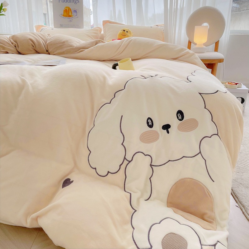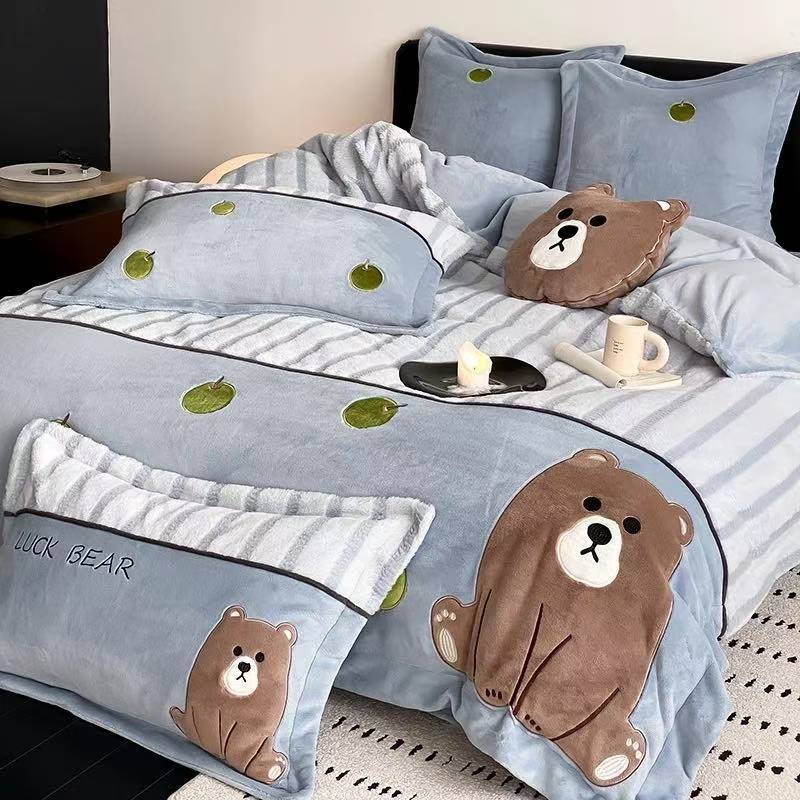 かわいいアニメ風100sベルベット綿綿4点セットベアー刺繍フレッシュ綿布団カバー寝具