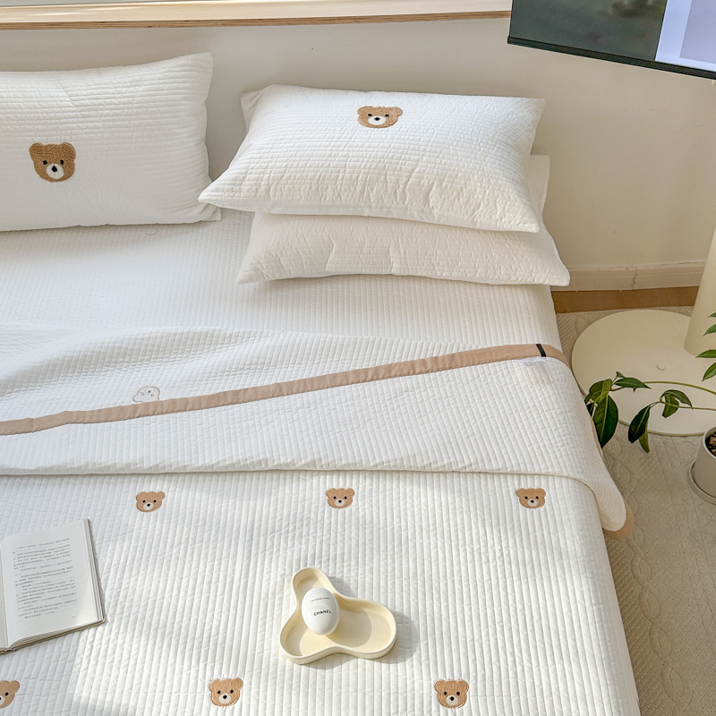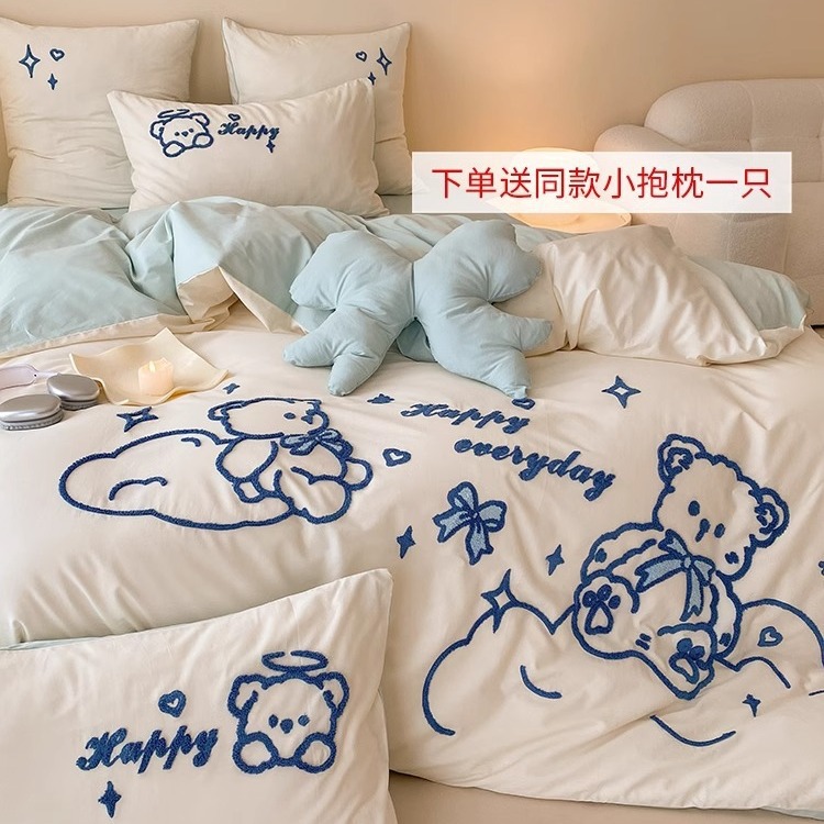 純綿洗濯綿キルティングベッドカバー四点セット熊刺繍40本綿布団カバーダブルベッドシンプル小清新