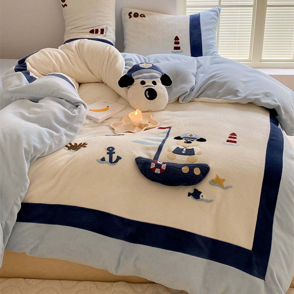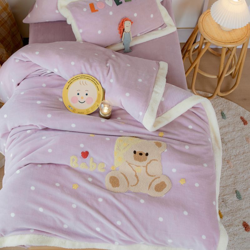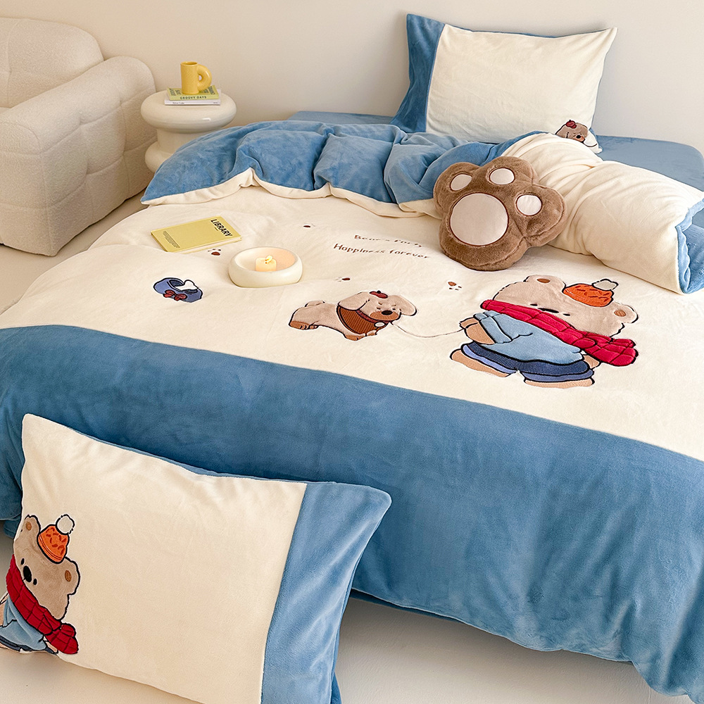 秋冬保温厚手新品ミルクウール4点セット熊バス刺繍宝宝パイル新品布団カバー3点セット