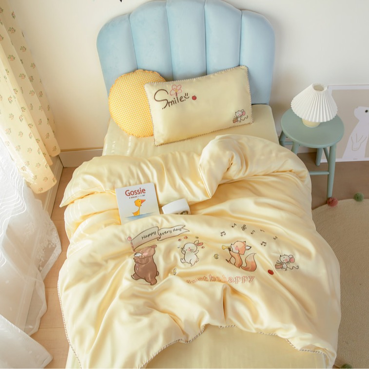 かわいい | 60本の天糸4点セットアニメ熊刺繍氷糸涼しい春夏の糸滑りシーツベッド笠