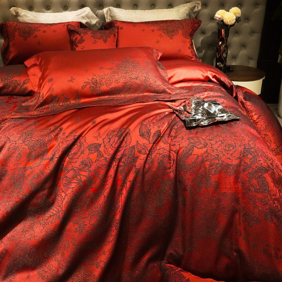 また、レザの高級な赤い結婚祝いの色織ジャカードの5点セットのイタリア式の高級シーツのベッドカバーの寝具