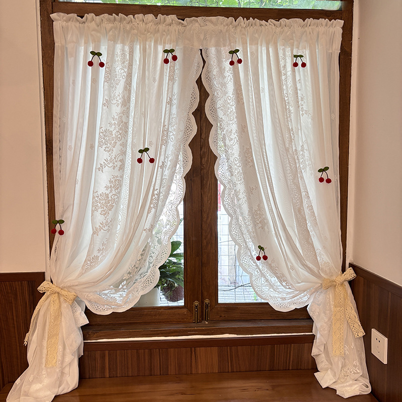 フレンチチェリー二重層ガーゼクリームスタイルカーテンレースガーゼカーテン光透過性と不透明な女の子プリンセス寝室の出窓