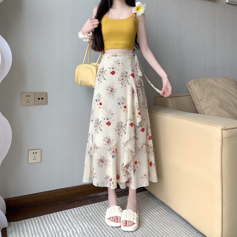 夏の花の半身のスカートの中の長いタイプの新型のストラップのシフォンの1枚式のスカートの休暇の日焼け止めのビーチのスカートはやせています。