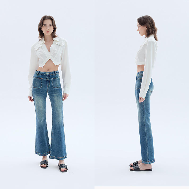 Nanyou 高バージョン 25 夏新 CE バックポケット凱旋門ロゴ刺繍スリムハイウエストマイクロフレアデニムパンツ女性用