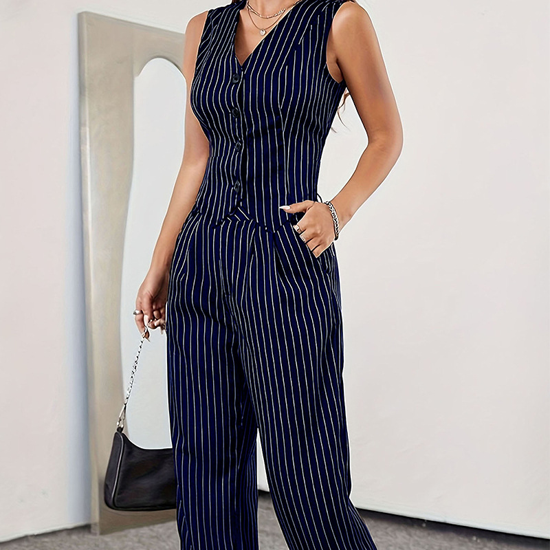 ストライプスーツカジュアルストライプボタンベストゆったりワイドレッグパンツツーピーススーツカスタマイズ加工