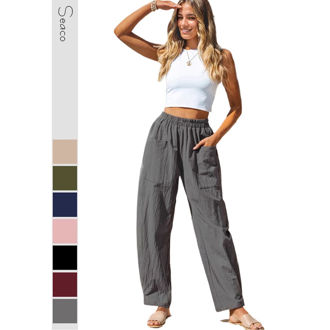 欧米の外国貿易の婦人服のアマゾン2025の女性の綿麻のカジュアルなズボンのリゾートの風は腰のバナナのズボンの工装の袋を緩めます。