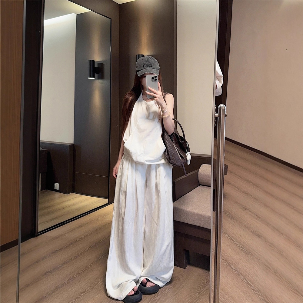 リアルショット〜ホルターネックバックレスカンガルーポケット巾着ノースリーブベストサスペンダー+ゆったりカジュアルワイドレッグパンツスーツレディース