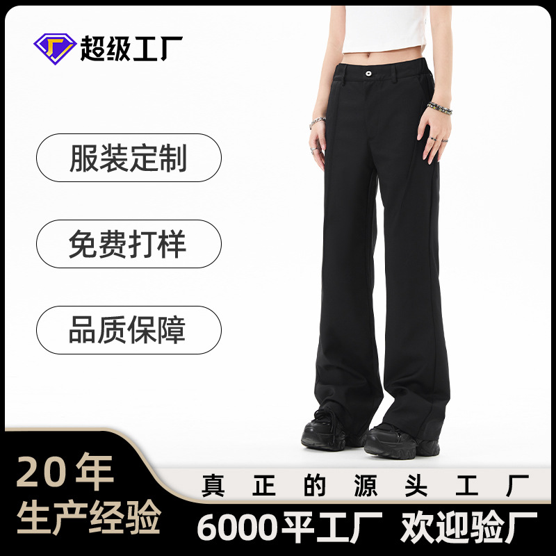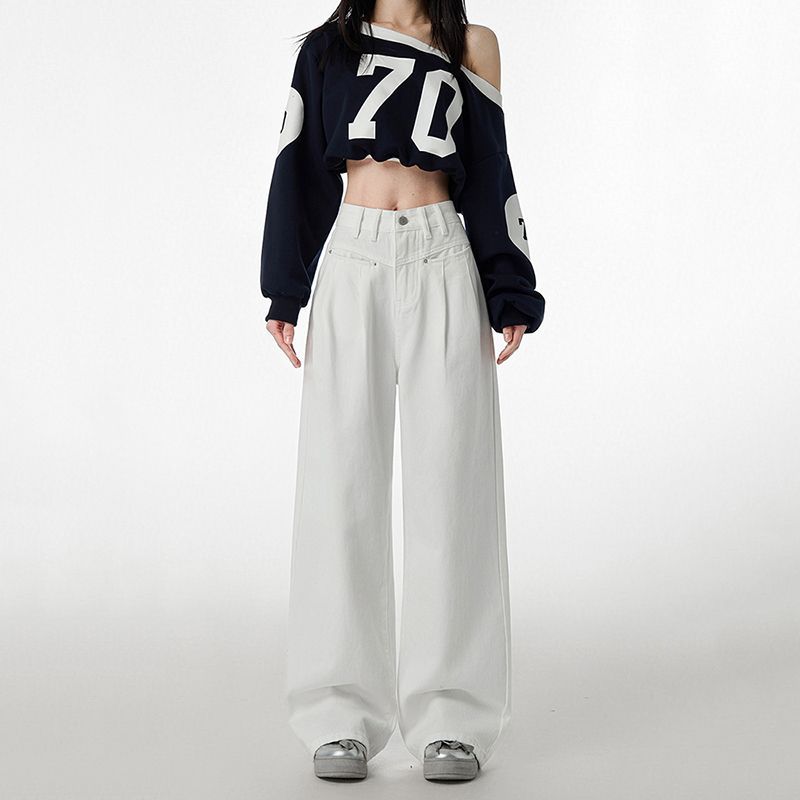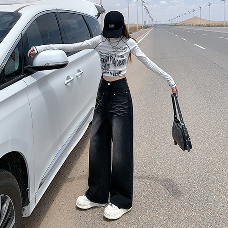 慕韓舎黒灰色開袋設計しわ水洗2024新高腰痩せ広脚ジーンズ女