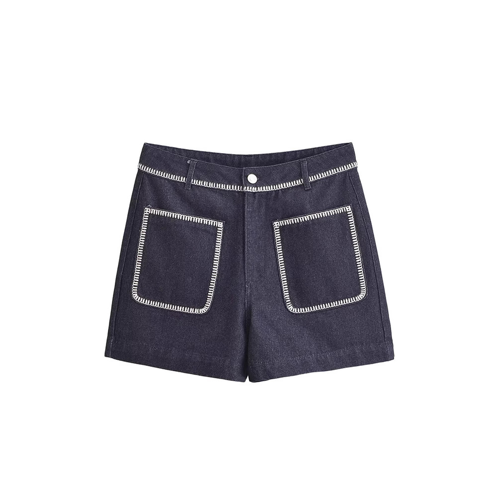 2025年夏の新作婦人服、ファッショナブルで多用途、コントラストカラーの刺繍とラインのハイウエストデニムパッチポケットショーツ