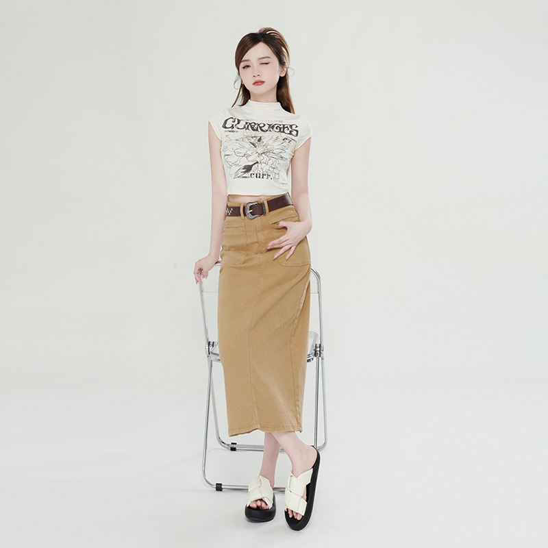 女性のための白い刺繍バックポケットハイウエストデニムスカート 2025 新しいミッドレングススリムヒップスリットスカート